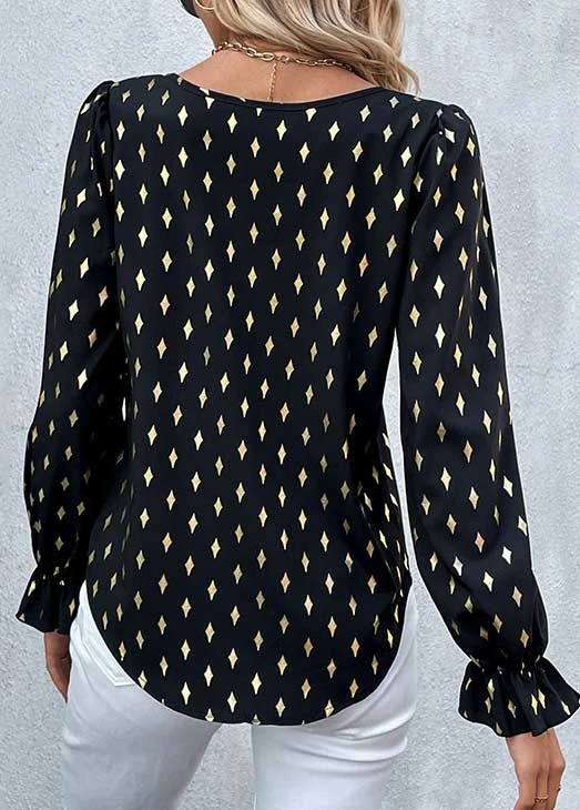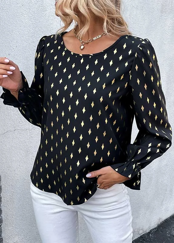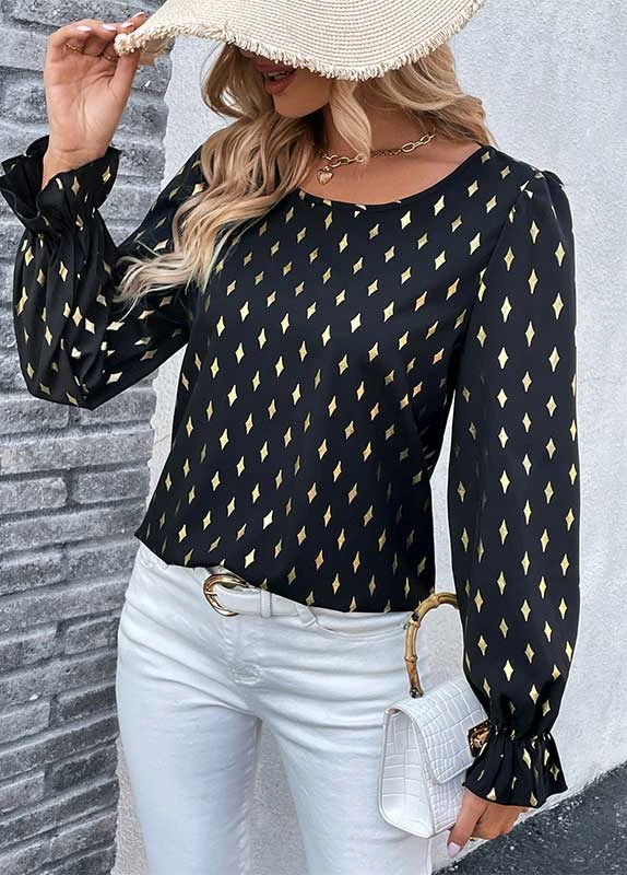 Argyle Print Hot Stamping Black Round Neck Blouse