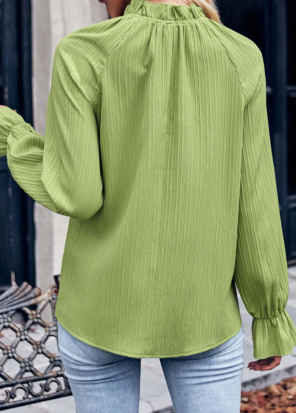 Avocado Green Stand Collar Long Sleeve Ruched Blouse