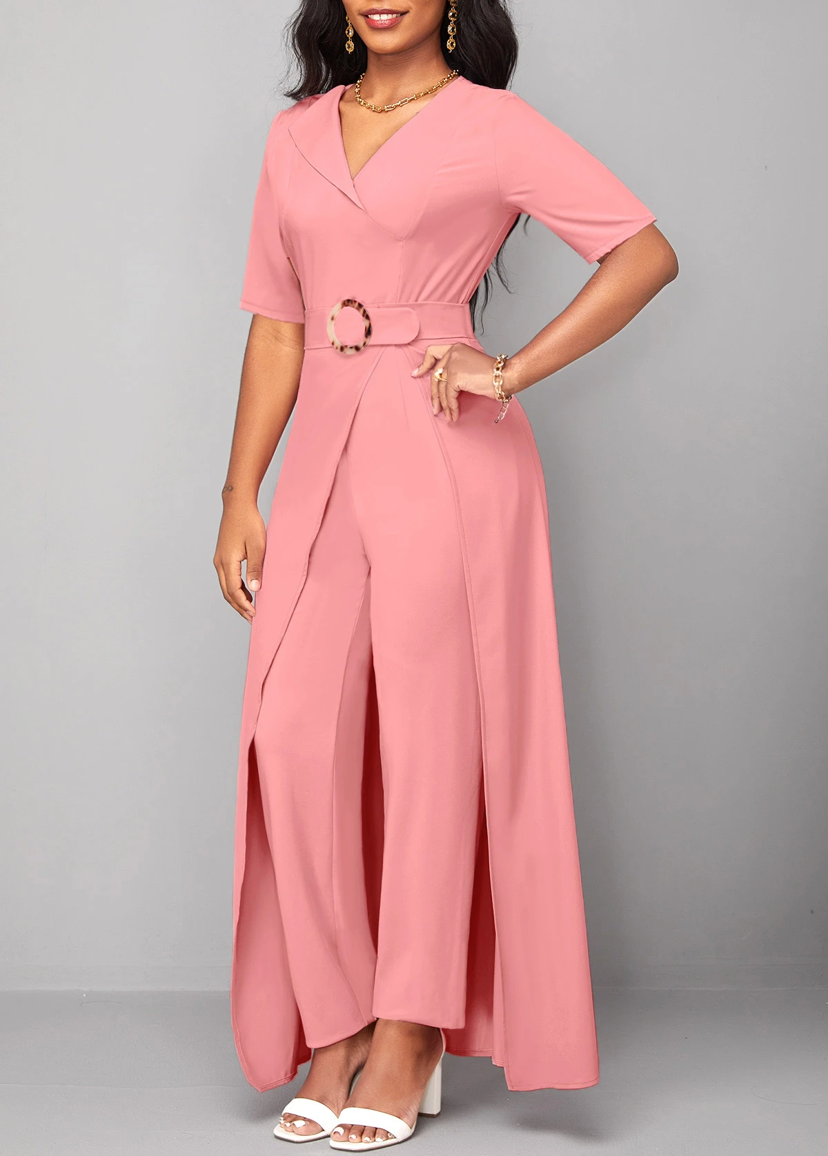 Belted Pink Short Sleeve V Neck Jumpsuit
