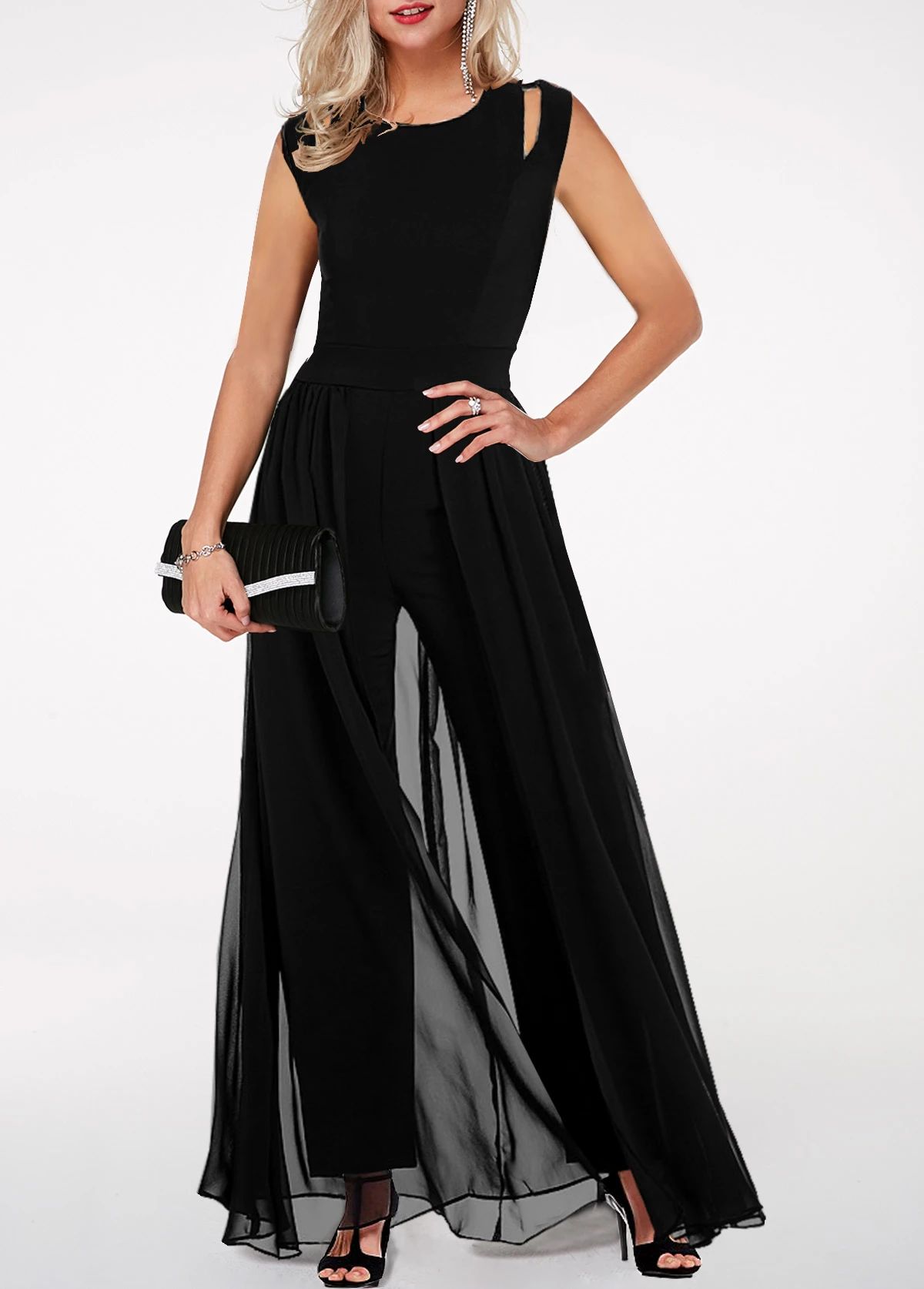 Black High Waist Round Neck Chiffon Overlay Jumpsuit