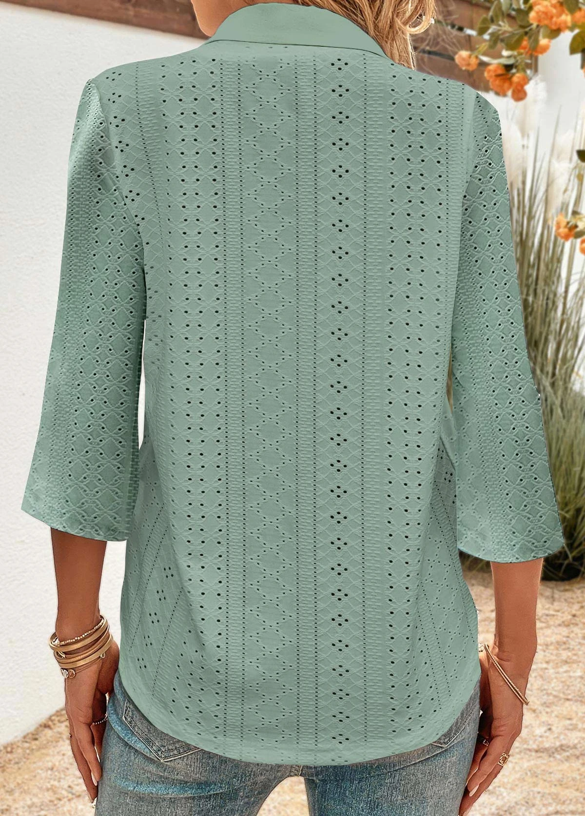 Button 3/4 Sleeve Green Shirt Collar Blouse