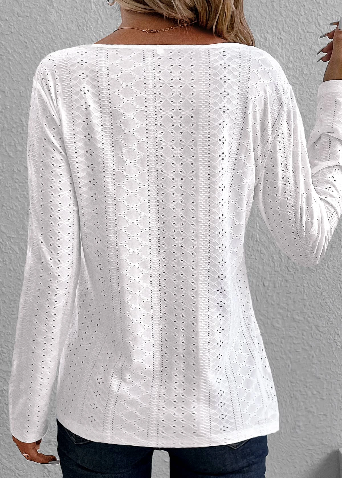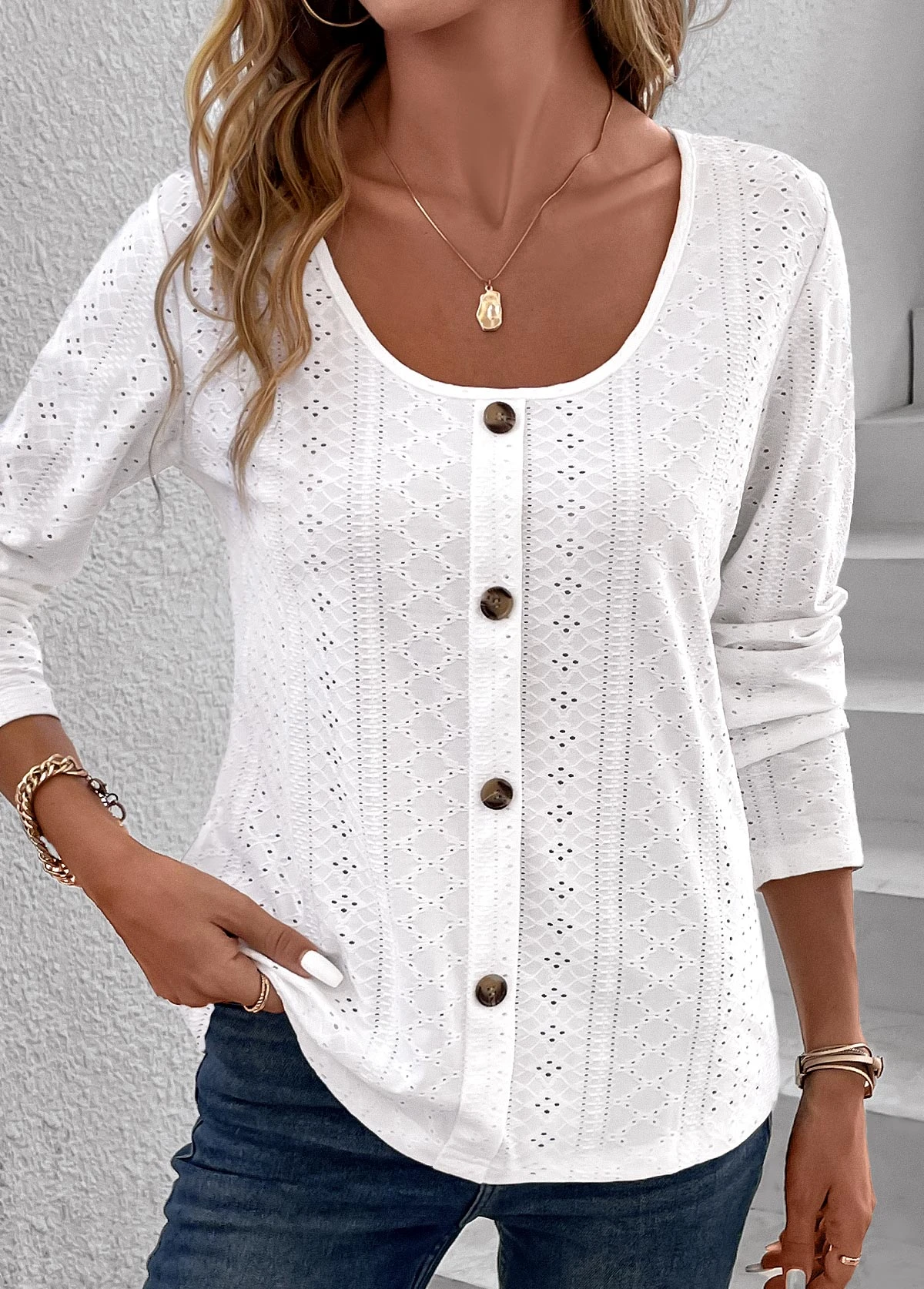 Button Hollow White Scoop Neck Long Sleeve T Shirt
