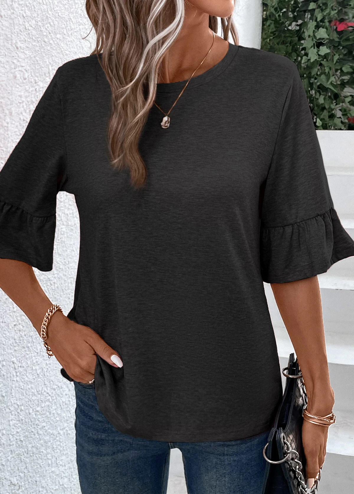 Button Round Neck Half Sleeve Black T Shirt