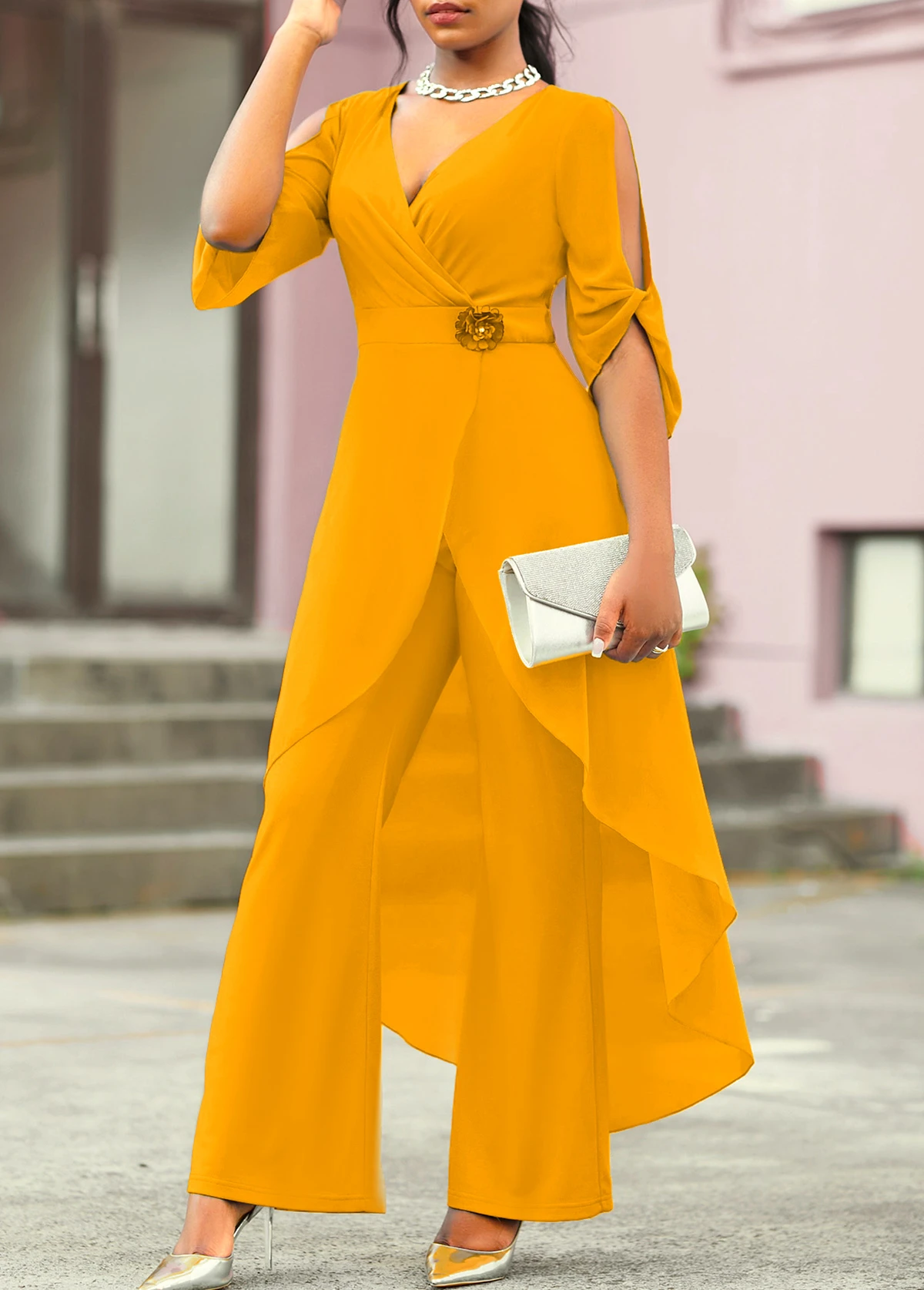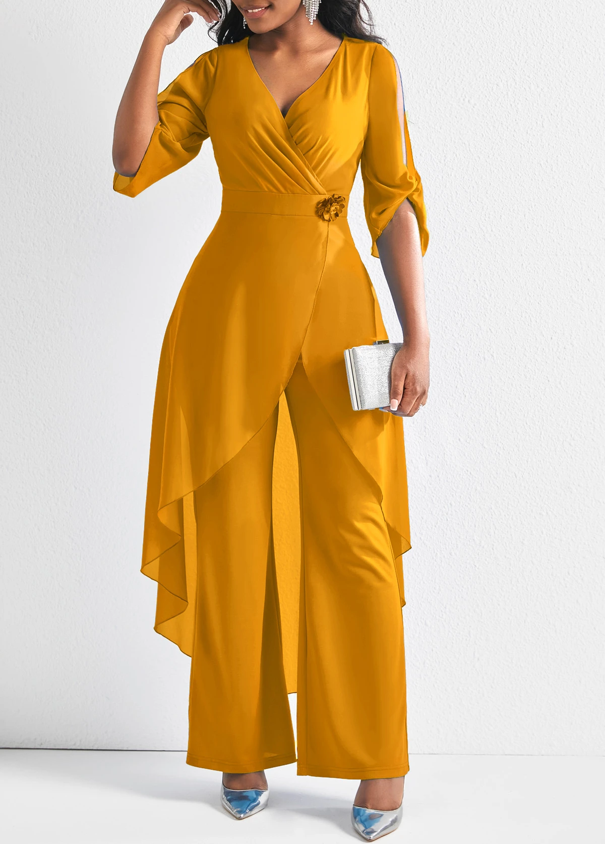 Chiffon Ginger 3/4 Sleeve Flower Decoration Jumpsuit