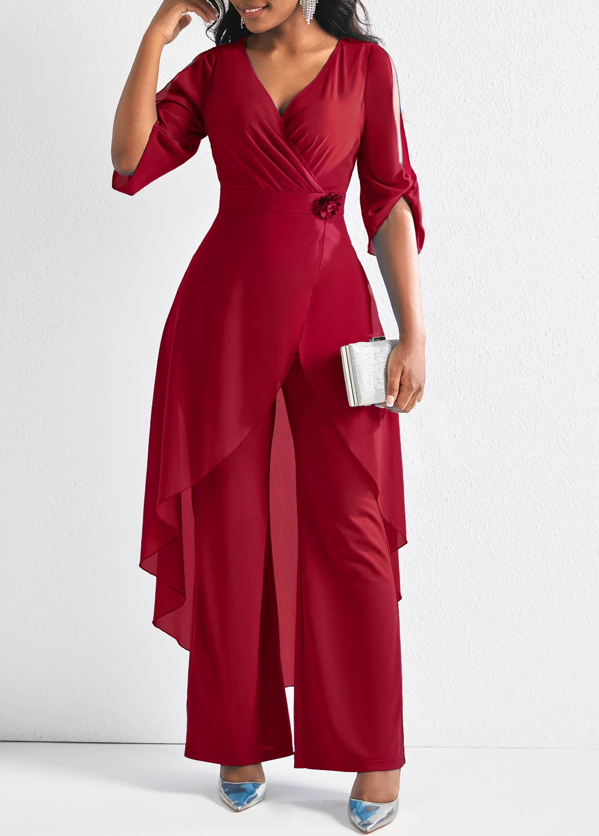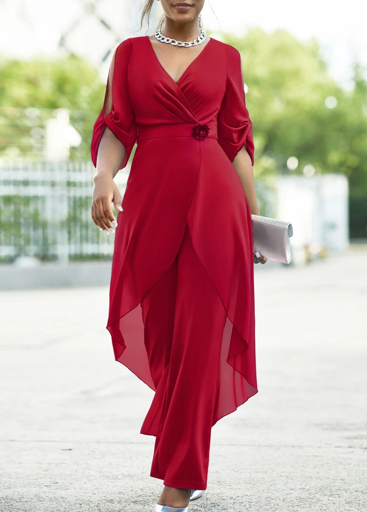 Chiffon Wine Red Flower Decoration Jumpsuit