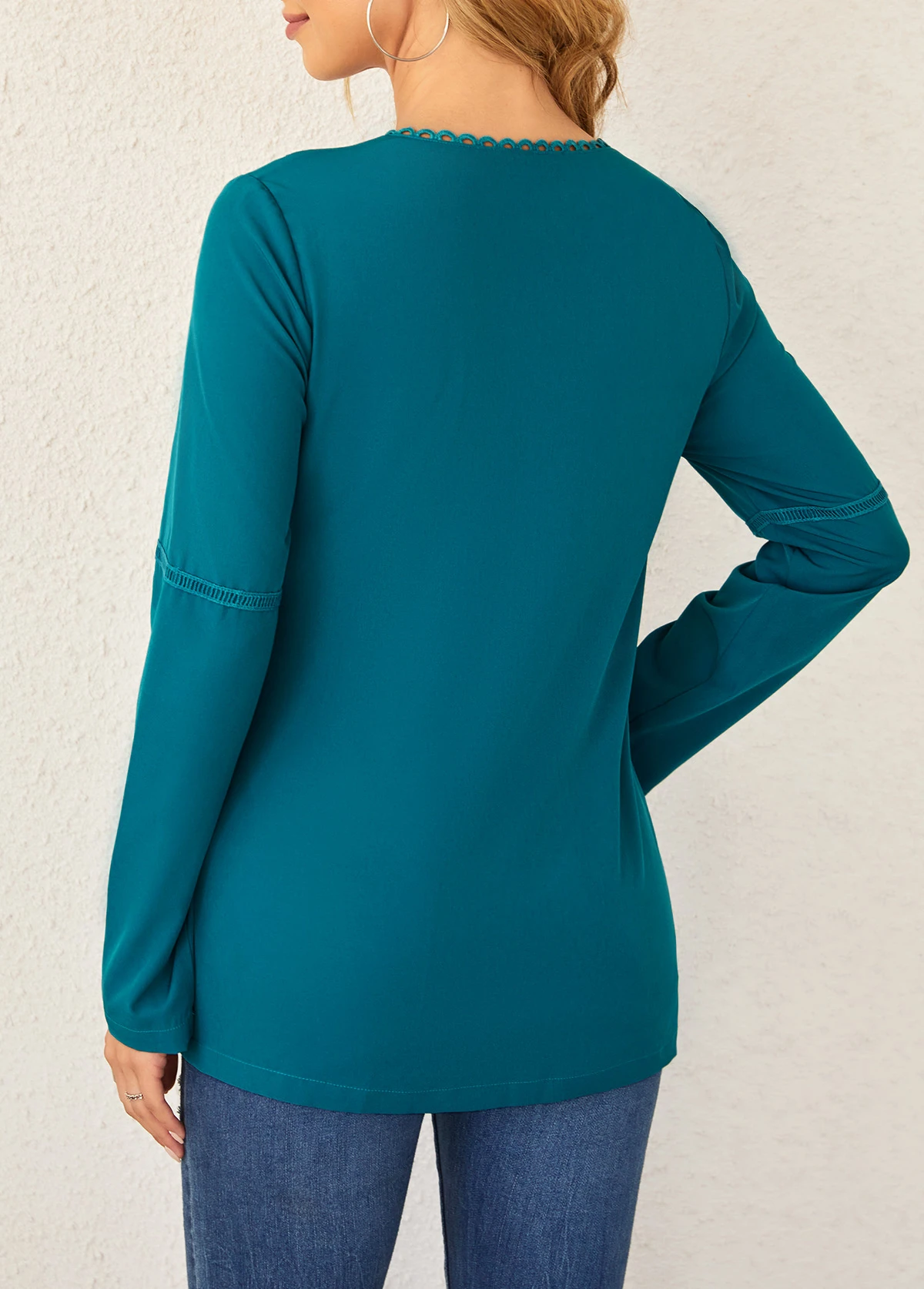 Crinkle Chest Lace Stitching Peacock Blue Blouse