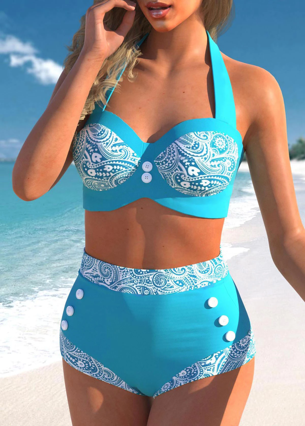 Cyan Paisley Print High Waisted Halter Bikini Set