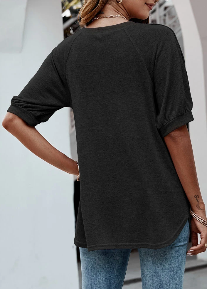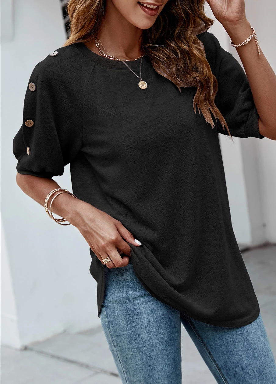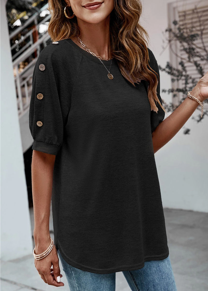 Be the first to review “Decorative Button Half Sleeve Black T Shirt” Cancel reply