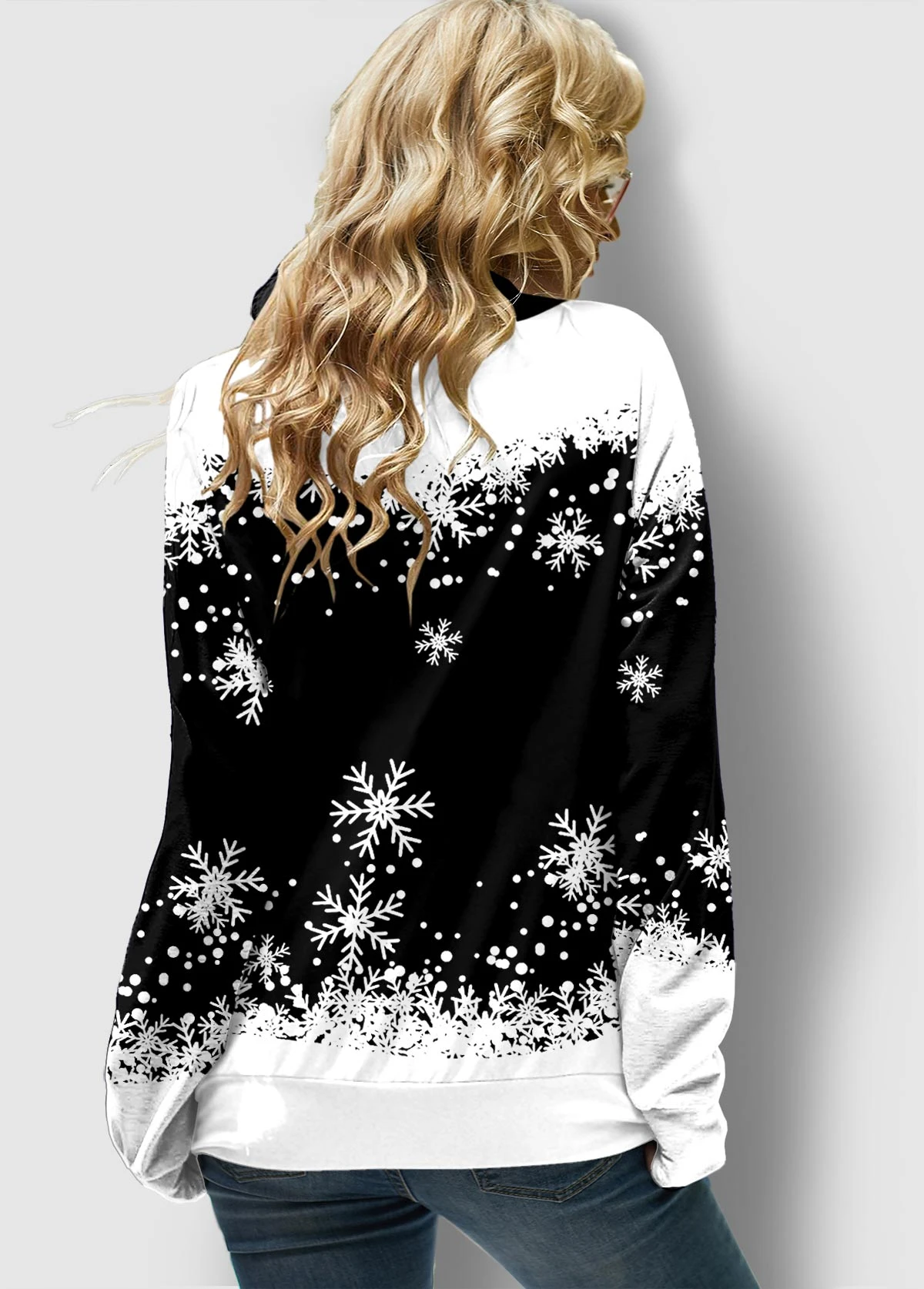 Drawstring Long Sleeve Snowflake Print Sweatshirt