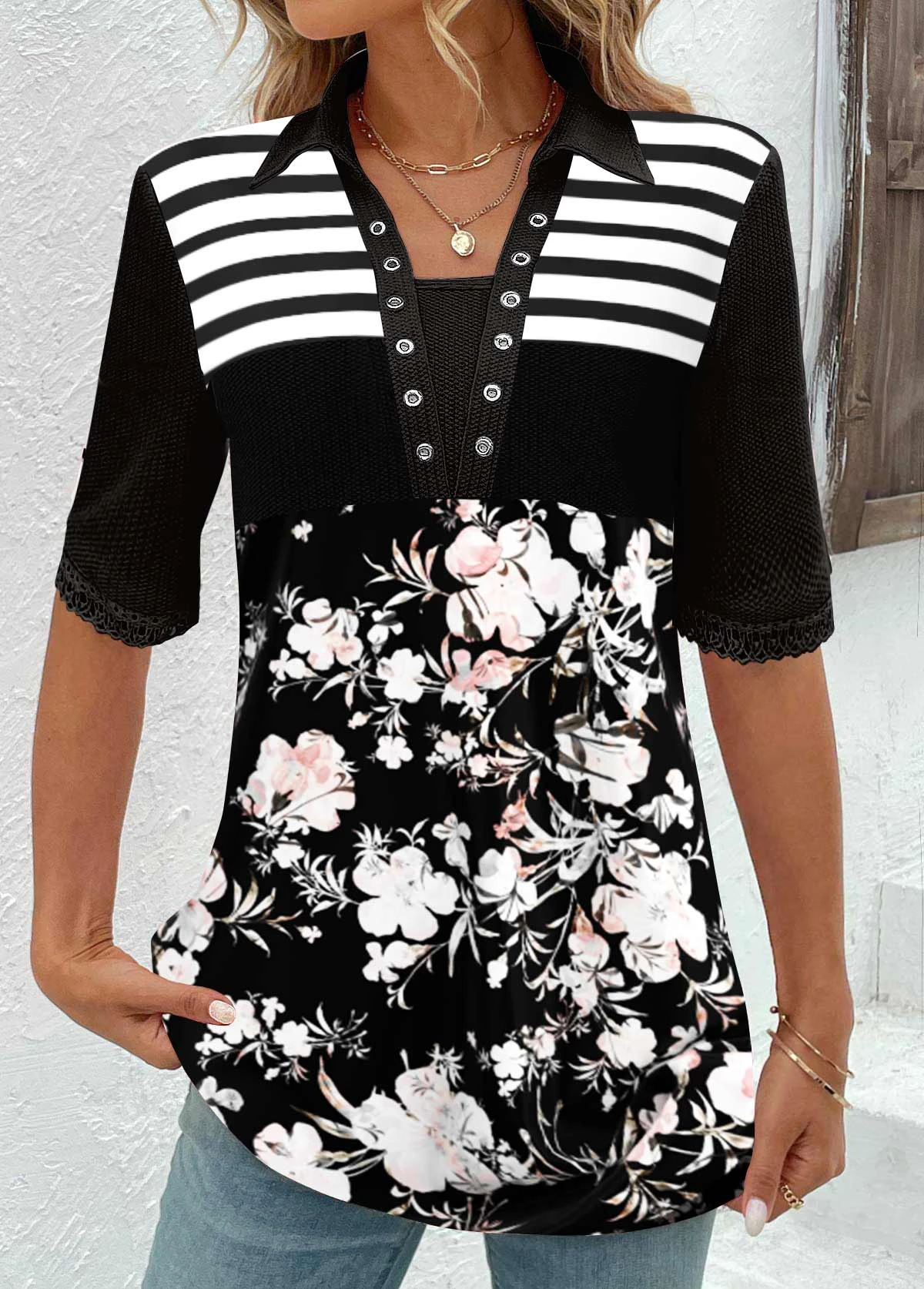 Floral Print Patchwork Black Half Sleeve T Shirt
