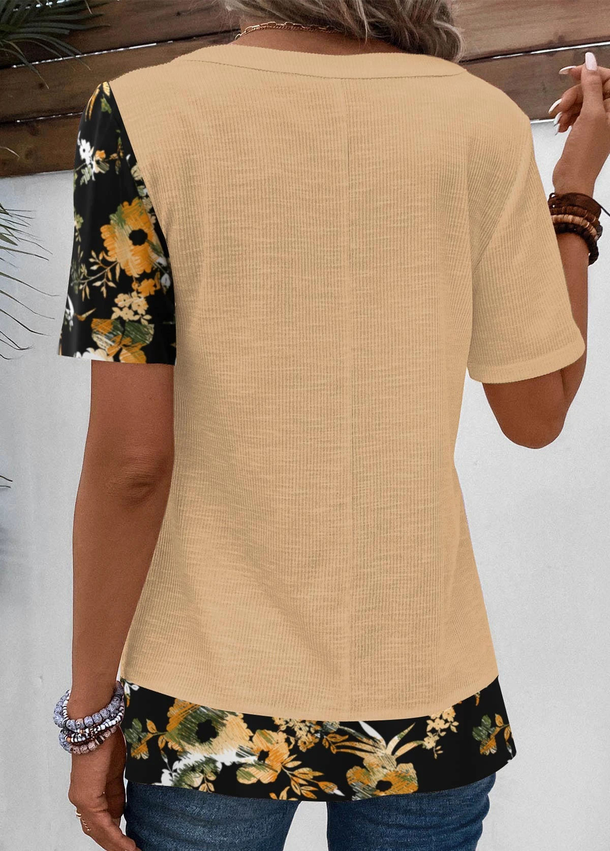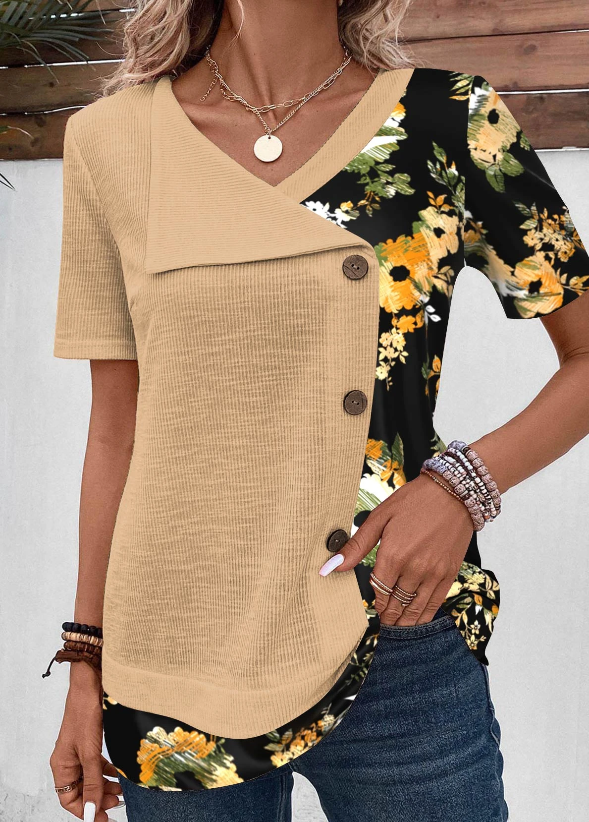 Floral Print Patchwork Light Camel Asymmetrical Neck Blouse