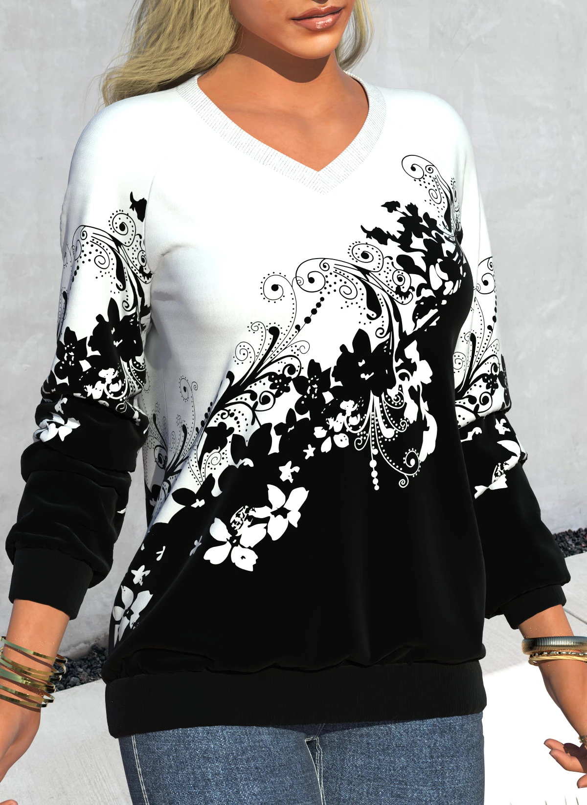Floral Print V Neck Long Sleeve Black Sweatshirt