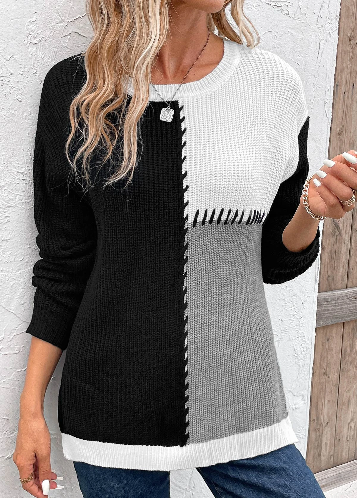 Be the first to review “Geometric Print Patchwork Black Round Neck Sweater” Cancel reply