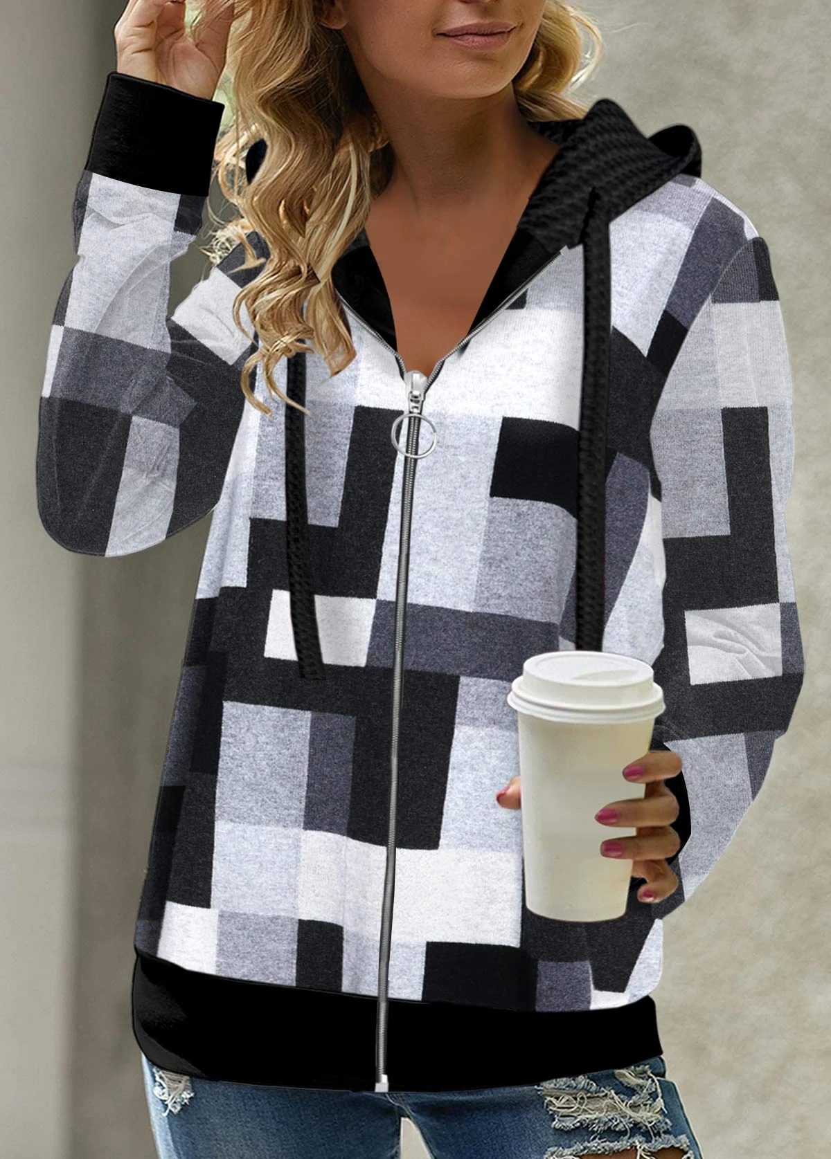 Geometric Print Zipper Black Long Sleeve Hoodie