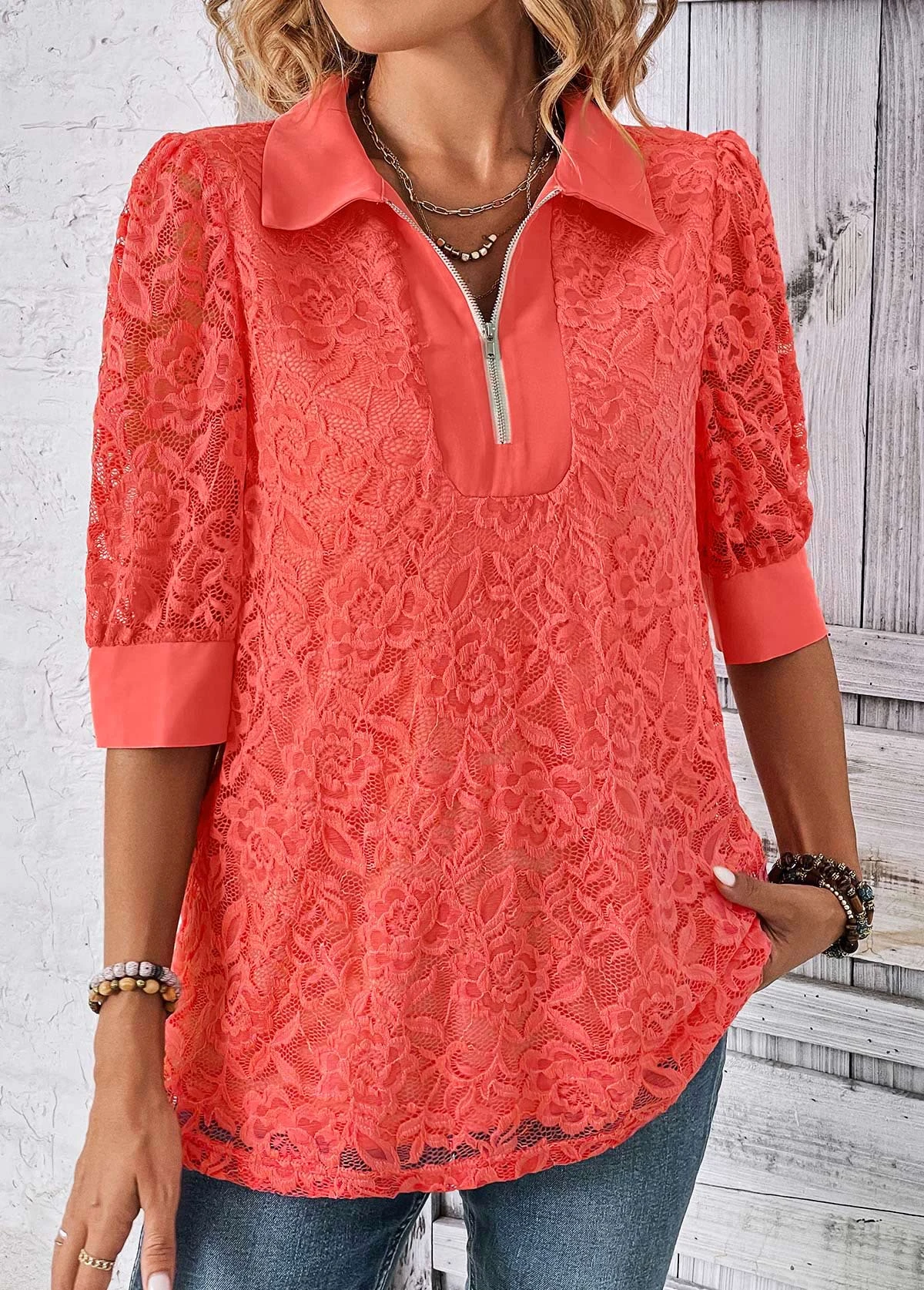 Half Sleeve Zipper Coral Shirt Collar Blouse
