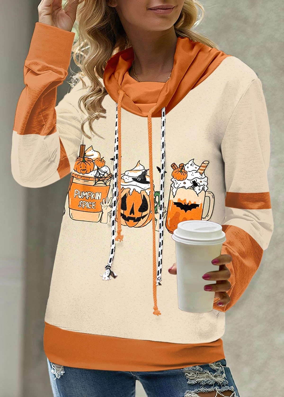 Halloween Print Patchwork Light Camel Cowl Neck Sweatshirt