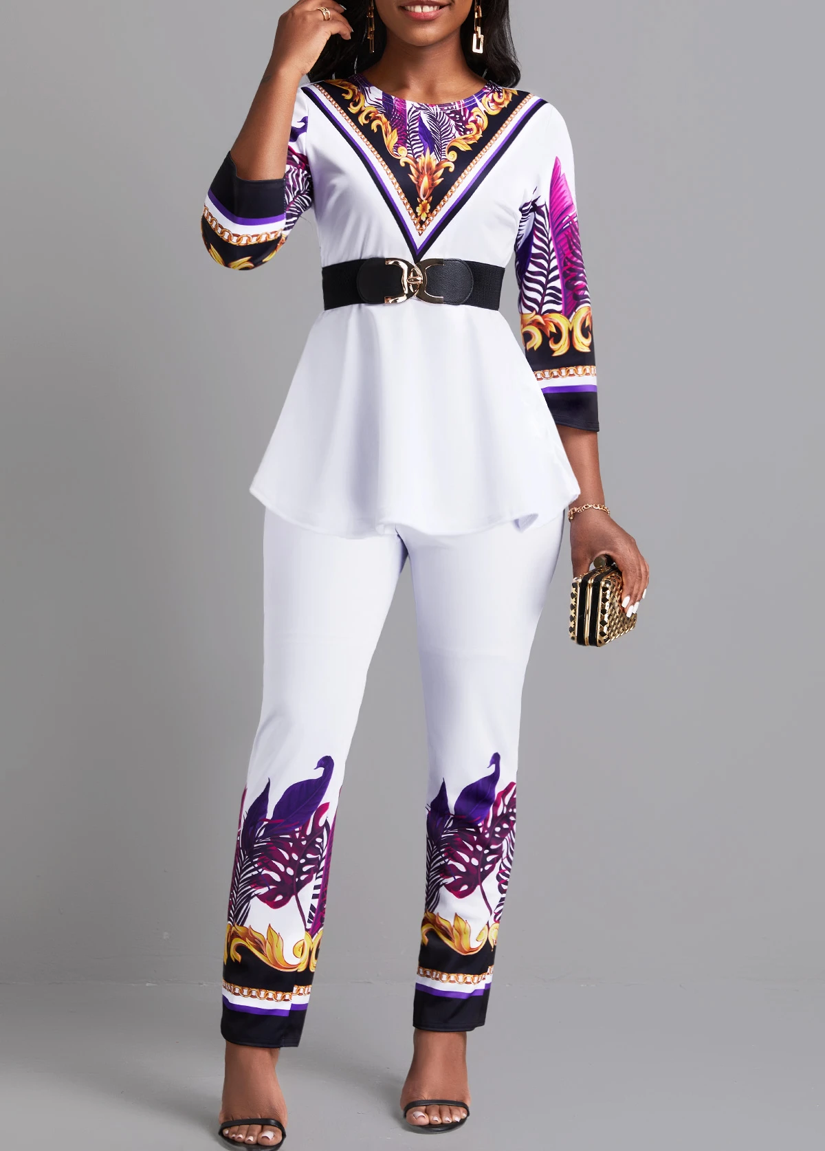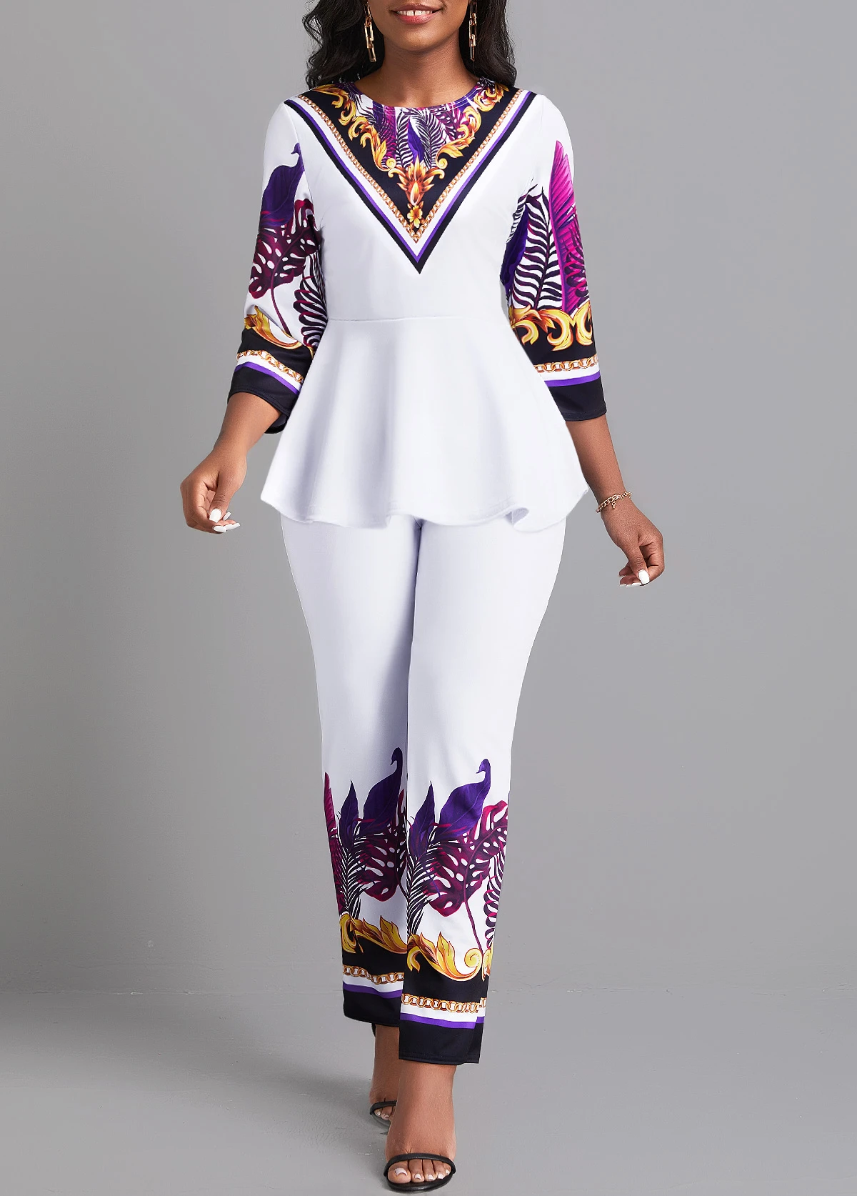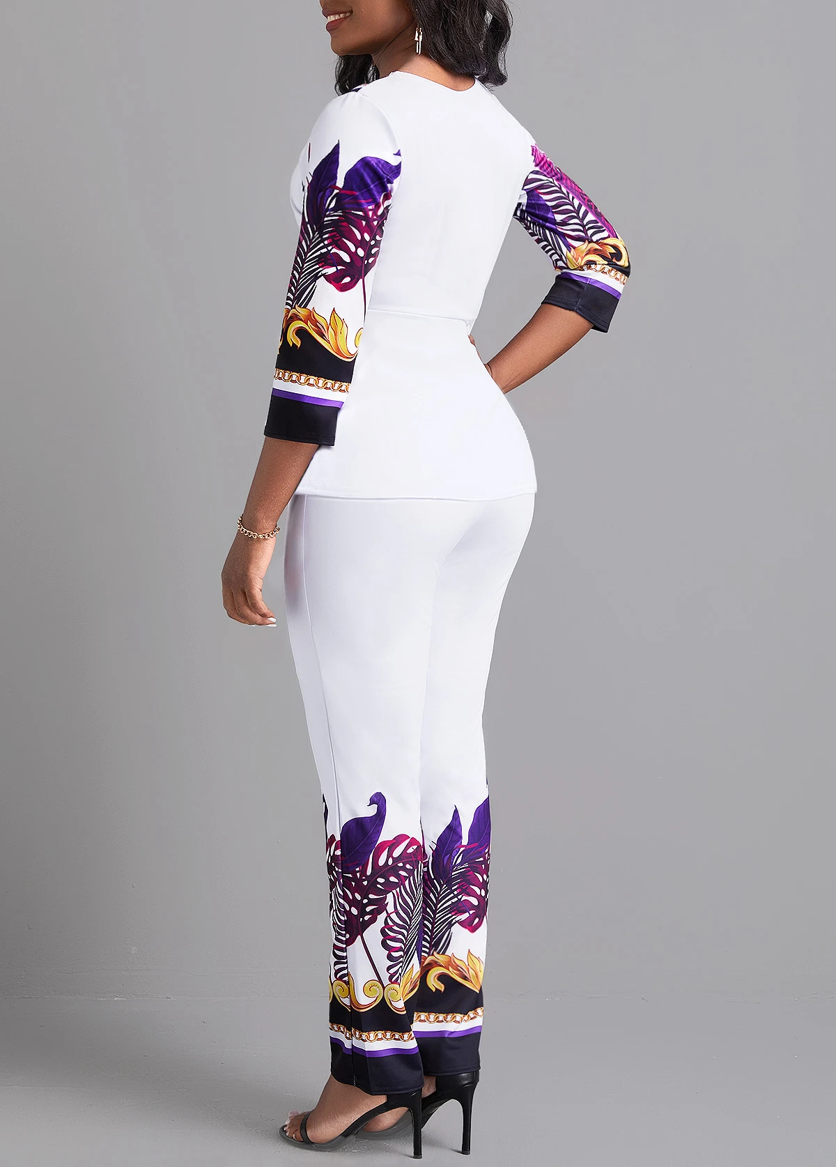 Leaf Print Ruffle White Ankle Length Top And Pants