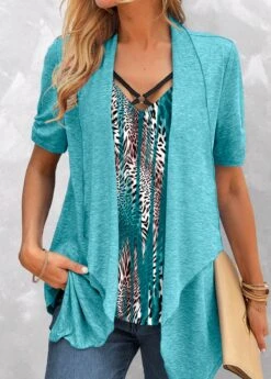Leopard Fake 2in1 Turquoise V Neck T Shirt