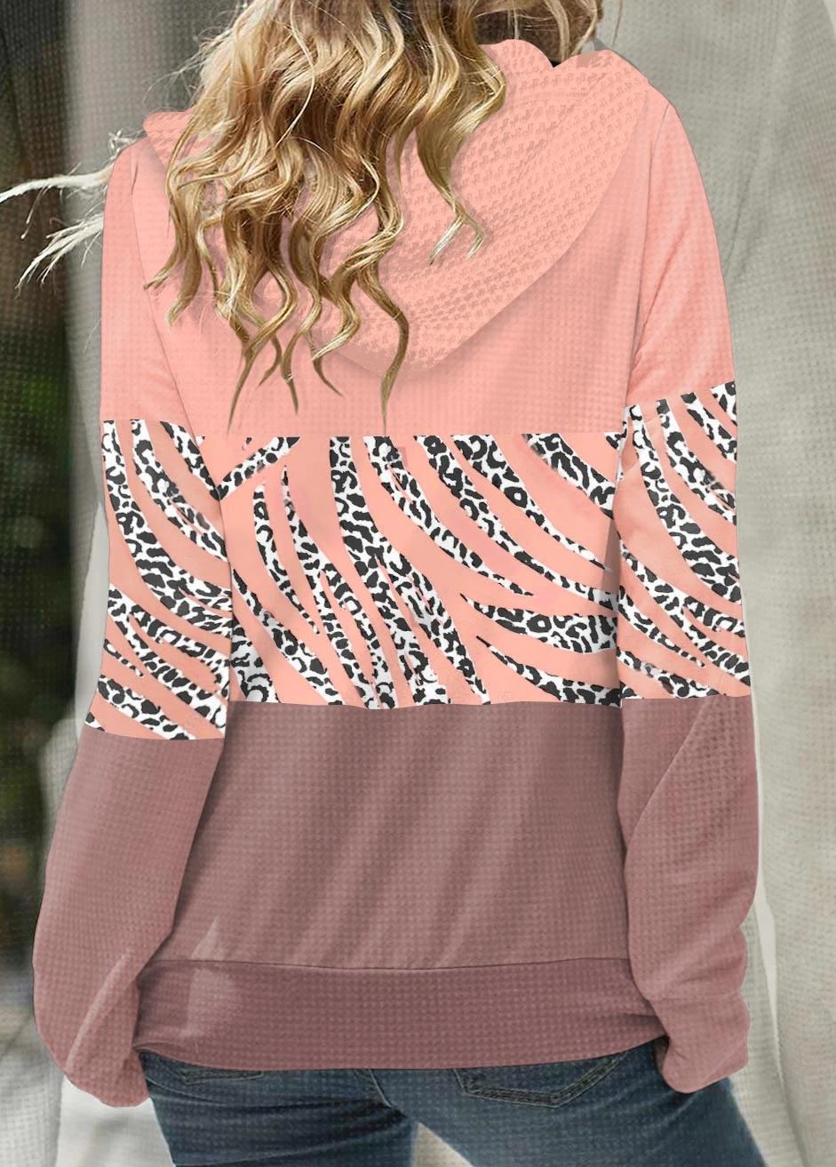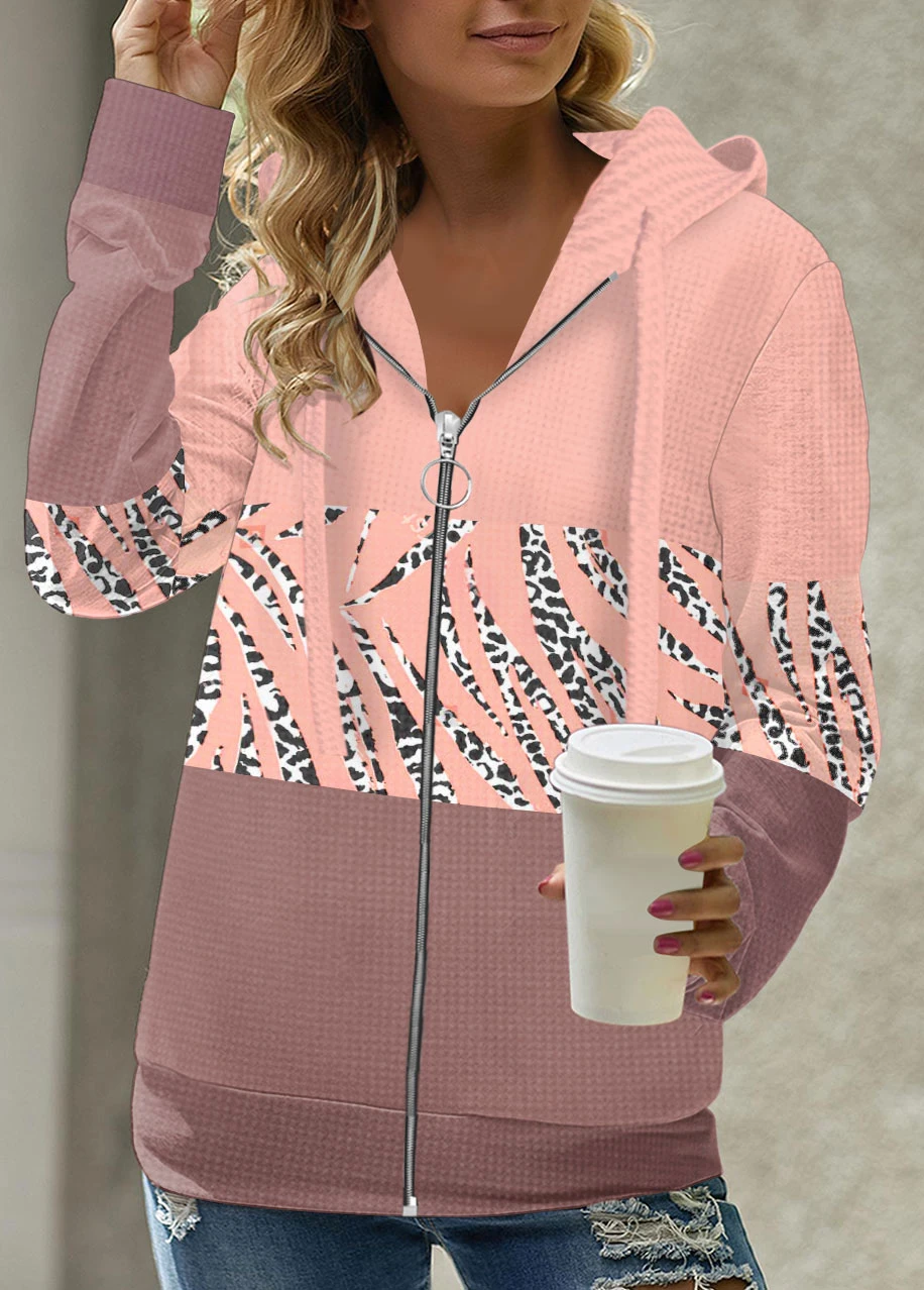 Leopard Zipper Pink Long Sleeve Hoodie