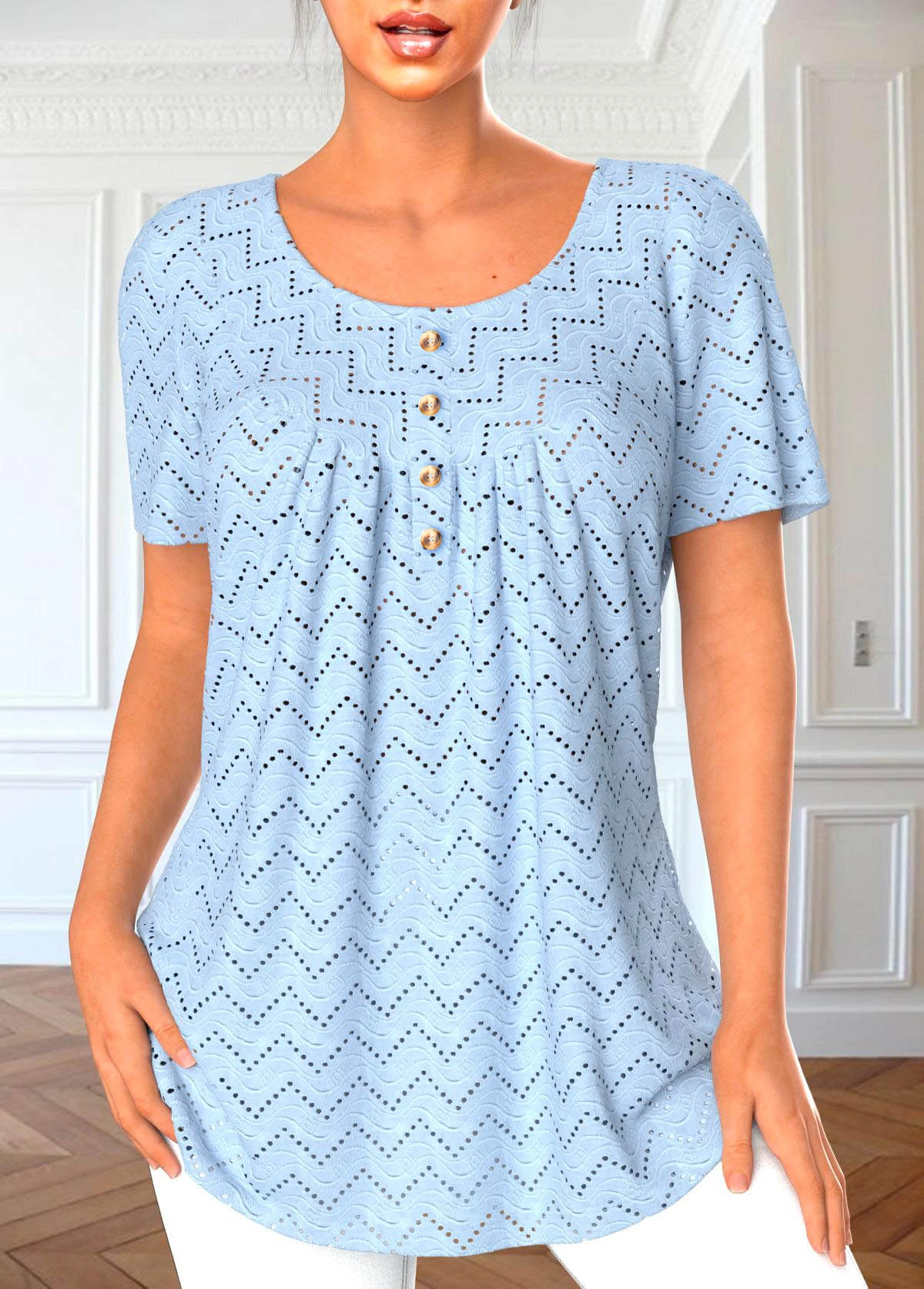 Light Blue Round Neck Short Sleeve Button Blouse