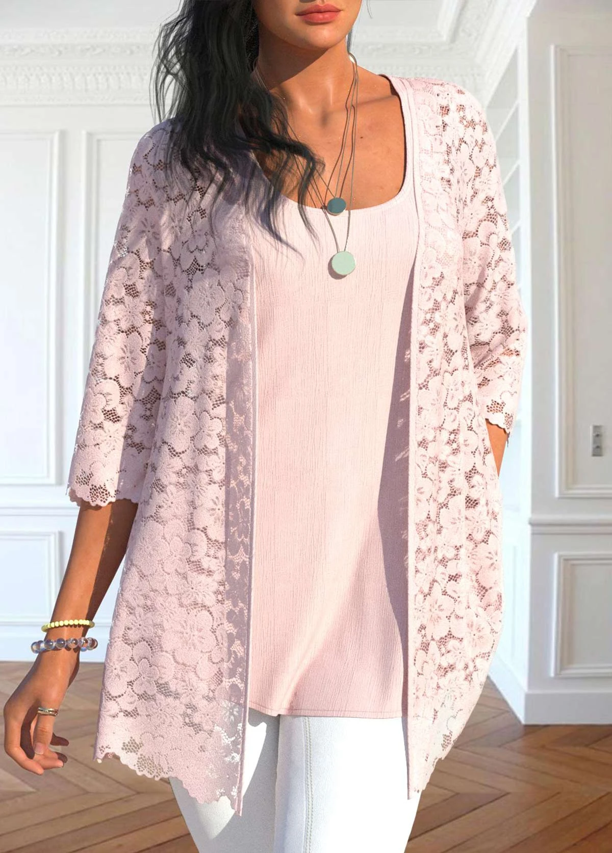 Light Pink Scoop Neck Lace Tank Top And Cardigan