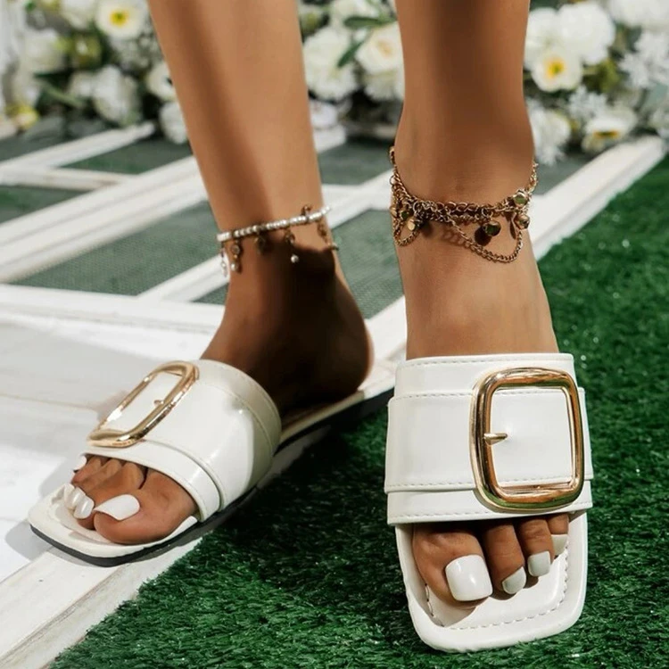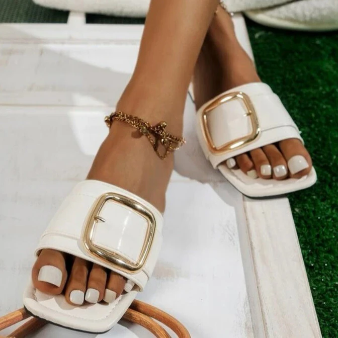 Be the first to review “Metal Detail White Open Toe Falt Sliders” Cancel reply