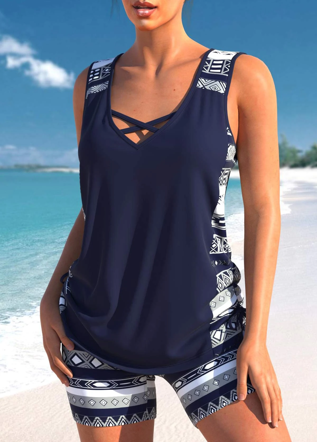 Be the first to review “Mid Waisted Geometric Print Drawstring Navy Tankini Set” Cancel reply