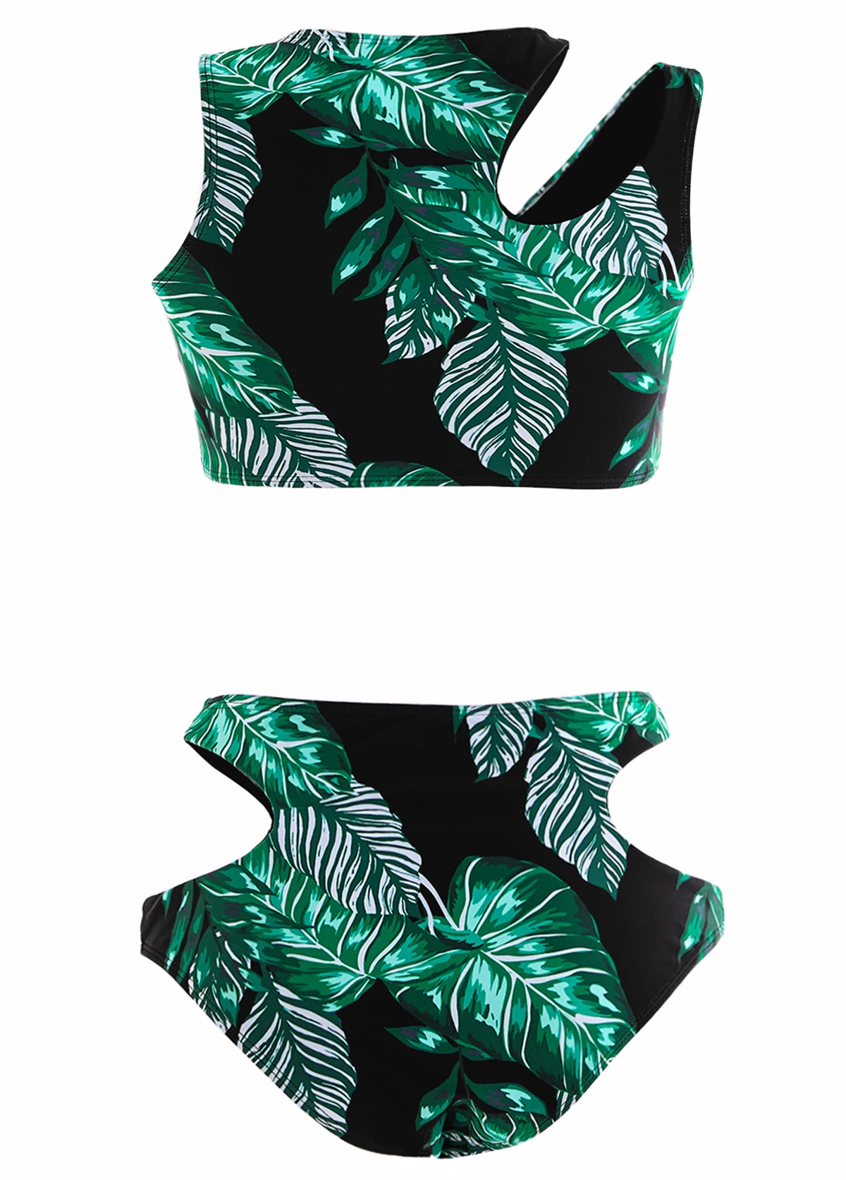 Mid Waisted Leaf Print Cut Out Black Bikini Set