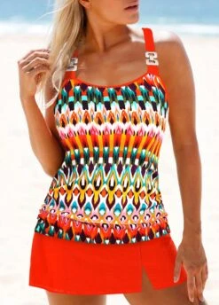 Mid Waisted Tribal Print Patchwork Orange Tankini Set
