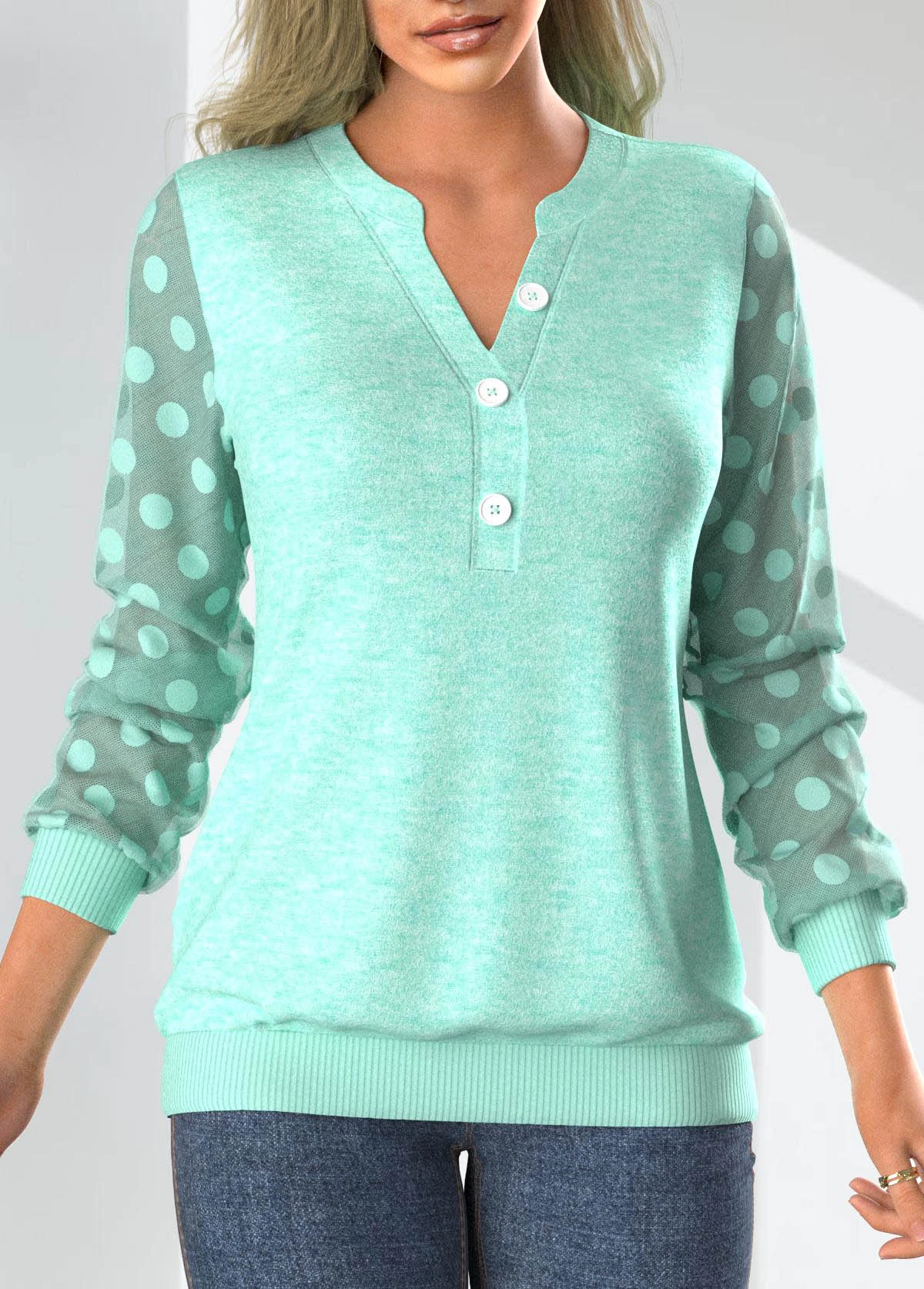 Mint Green Split Neck Long Sleeve Patchwork Sweatshirt