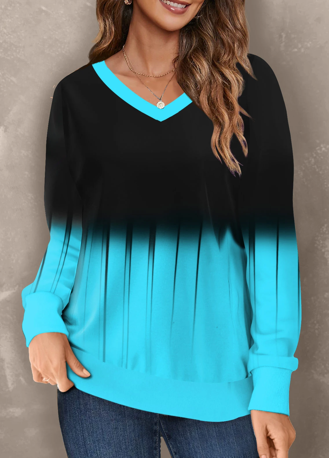 Ombre V Neck Cyan Long Sleeve Sweatshirt