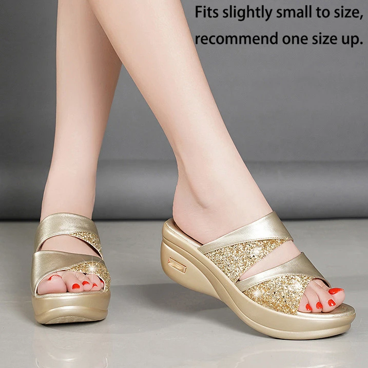 Open Toe Golden Mid Heel Sliders
