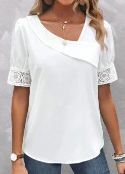 Patchwork Asymmetrical Neck Short Sleeve White Blouse