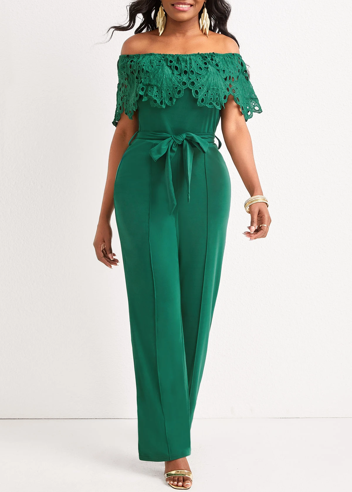 Patchwork Belted Green Ankle Length Off Shoulder Jumpsuit