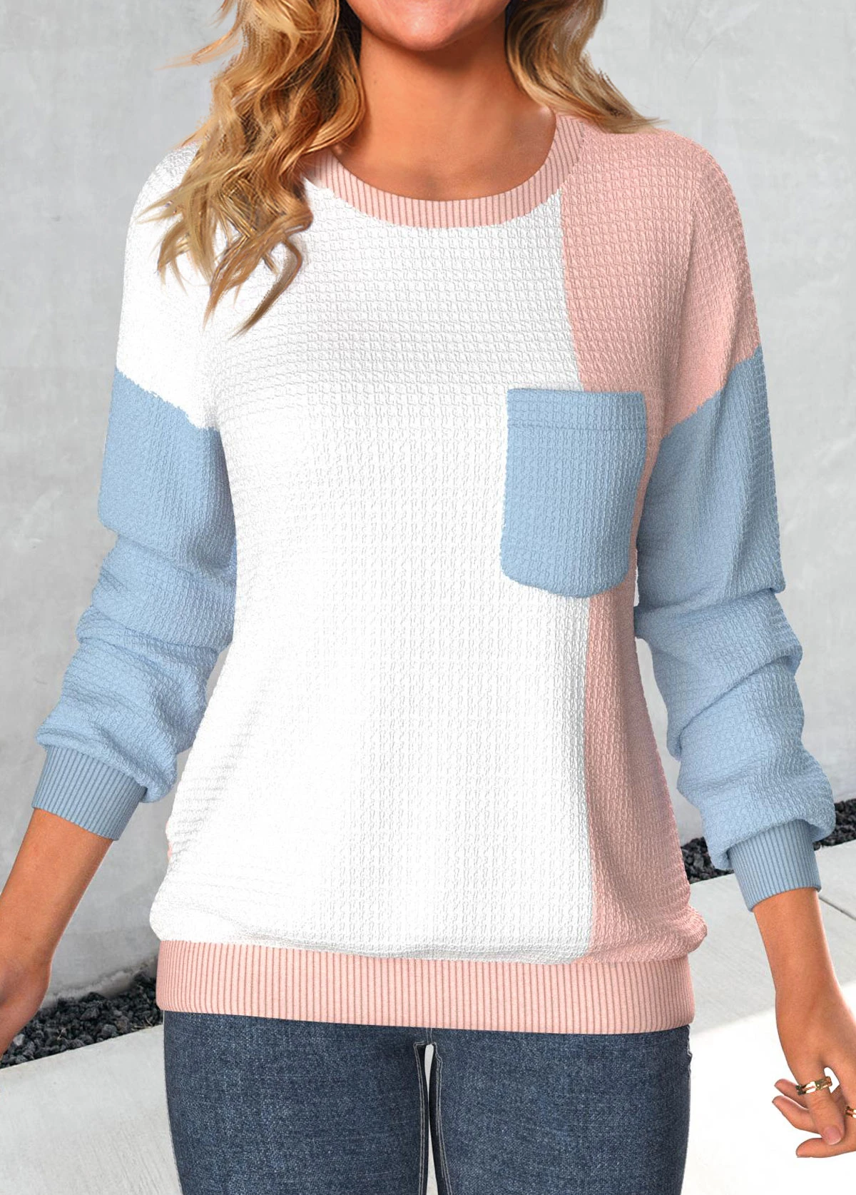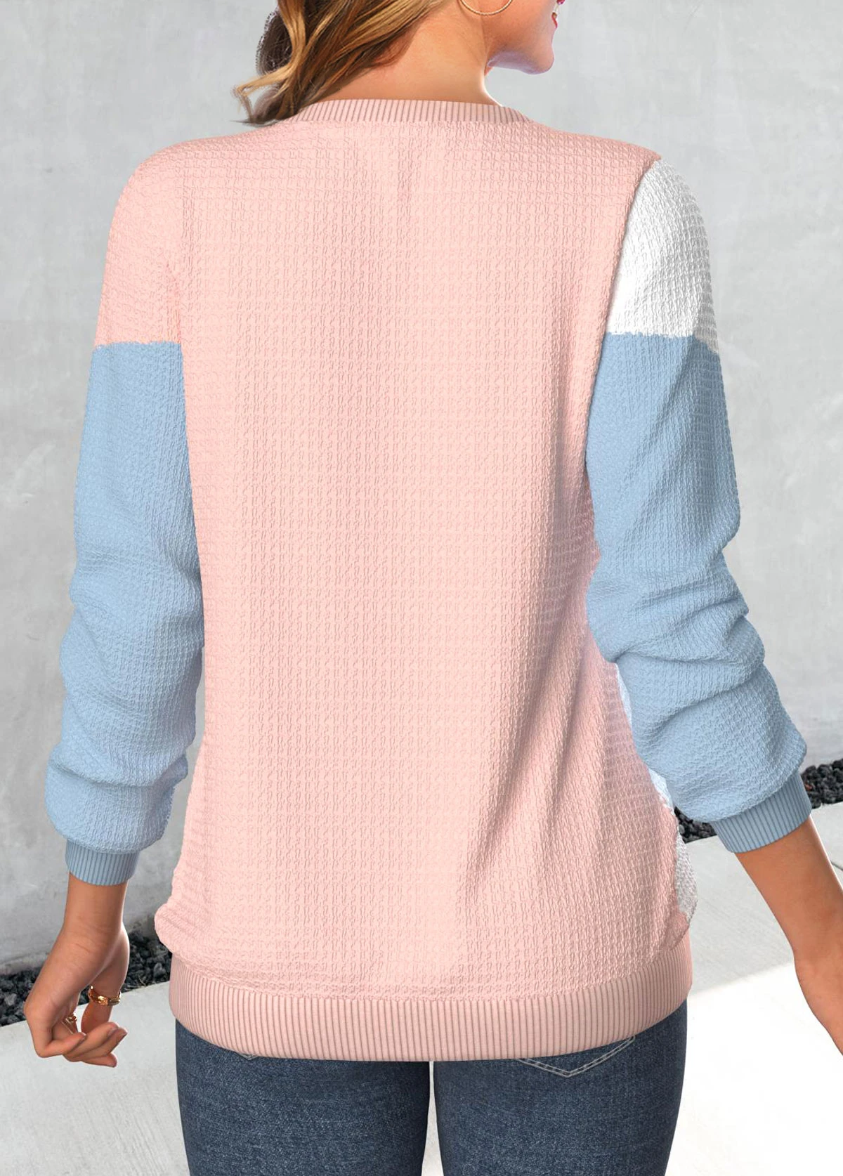 Patchwork Round Neck Long Sleeve Dusty Pink Sweatshirt