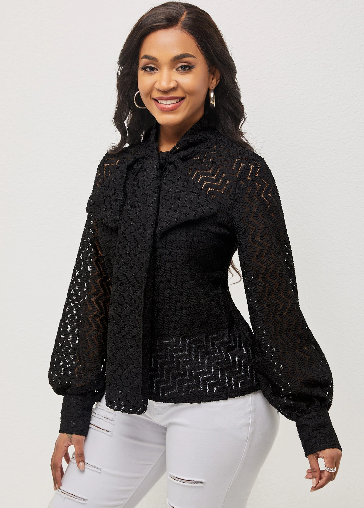 Pierced Tie Front Black Lantern Sleeve Blouse