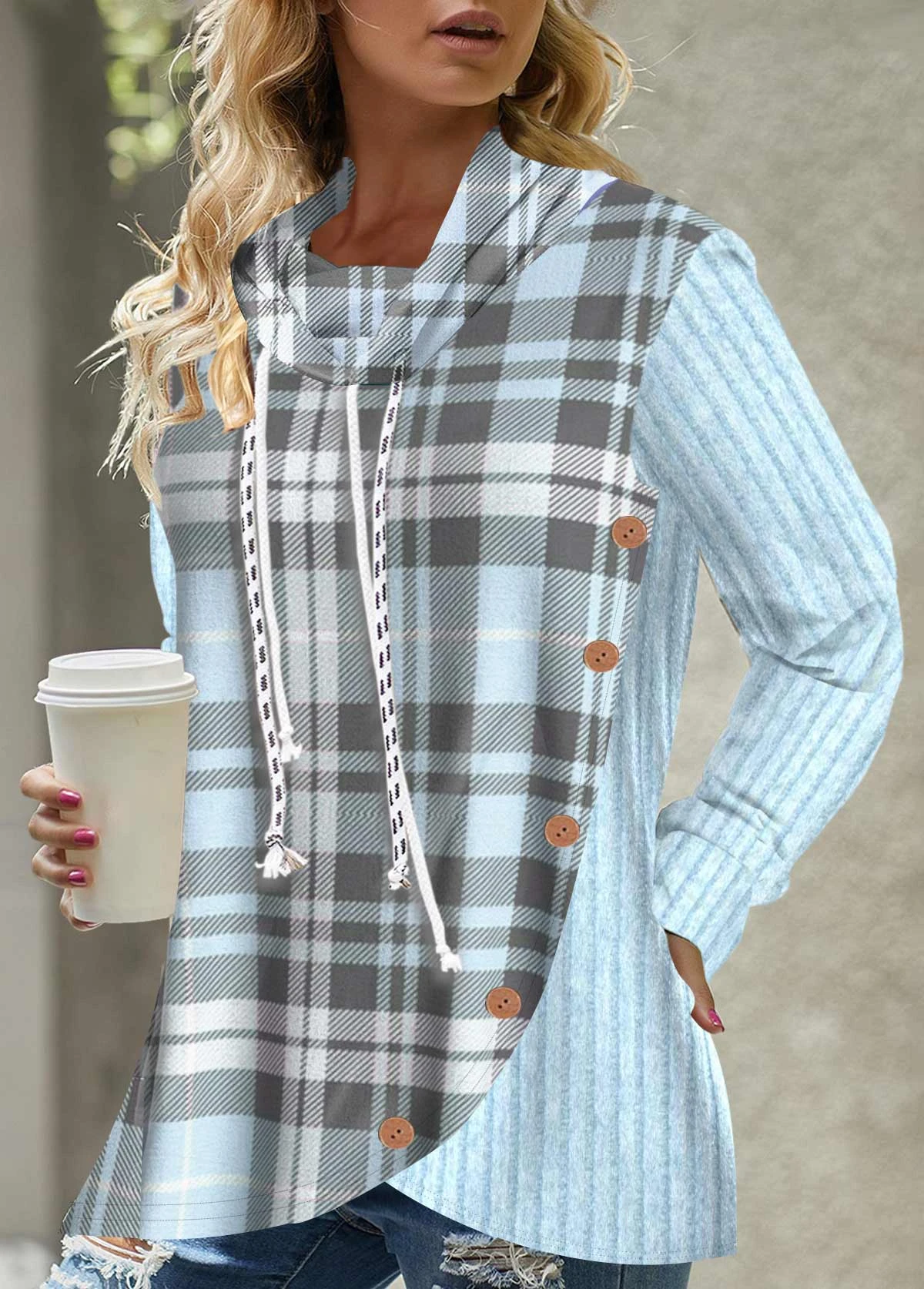 Plaid Button Blue Cowl Neck Long Sleeve Sweatshirt