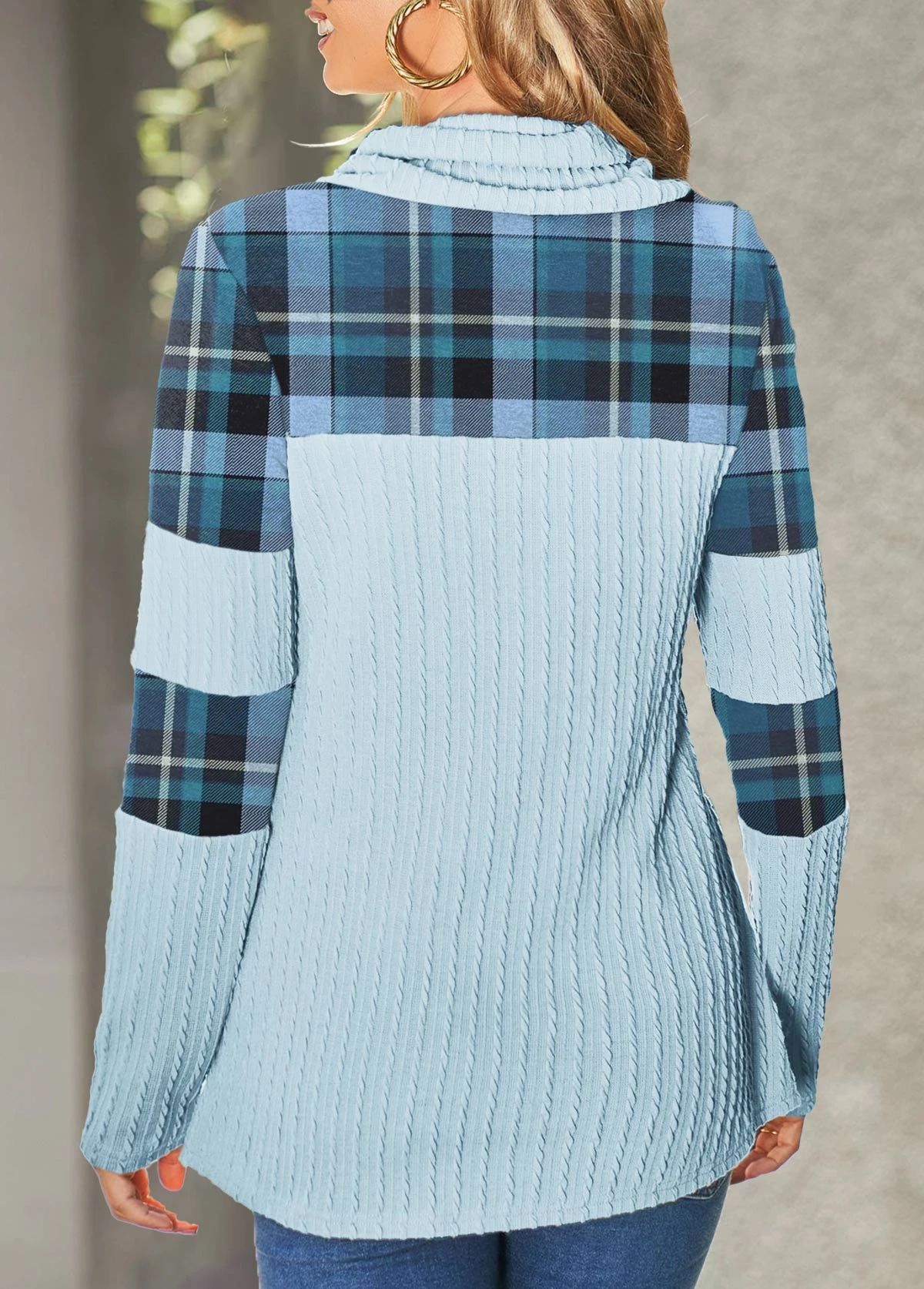 Plaid Patchwork Light Blue Cowl Neck Sweatshirt