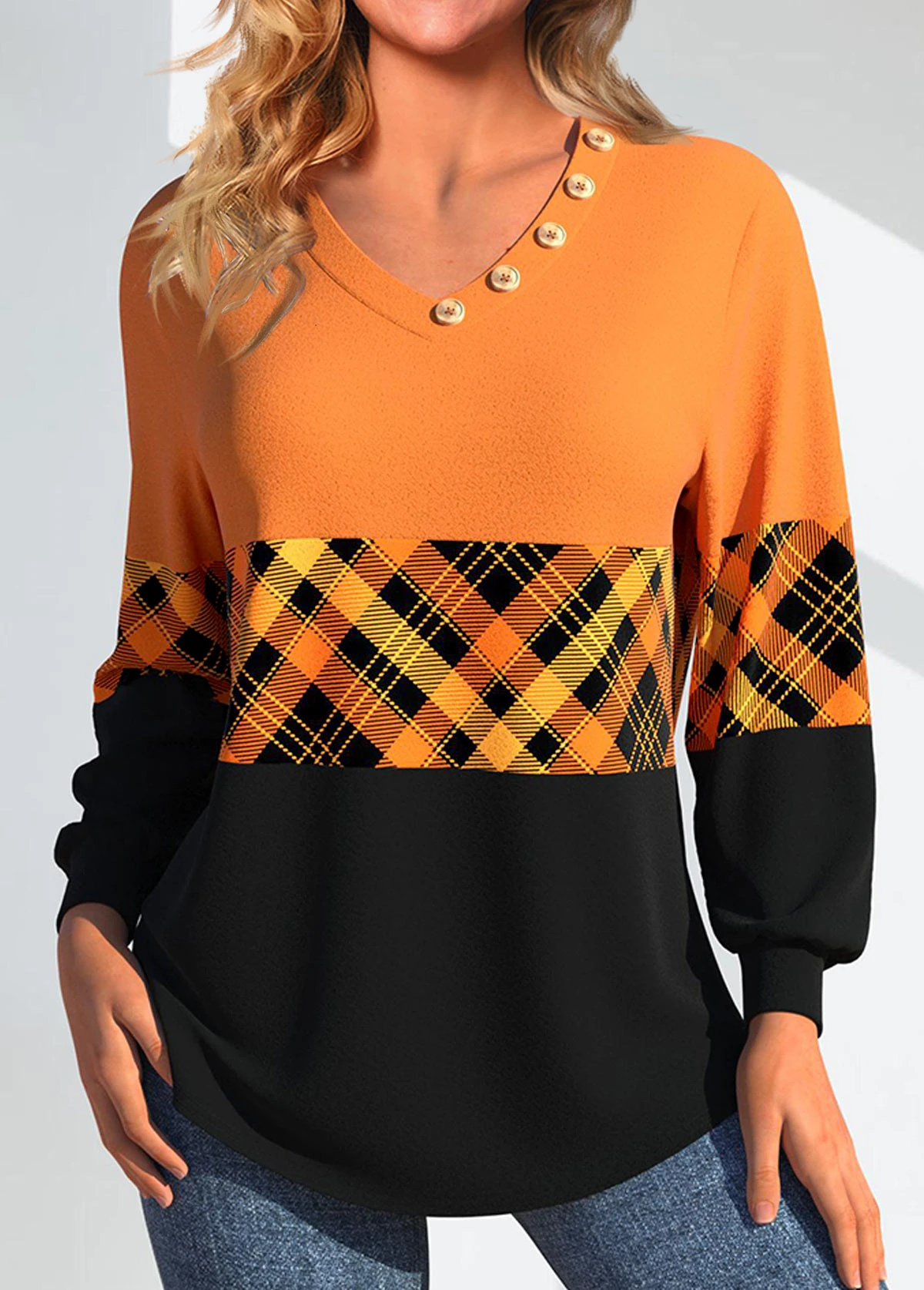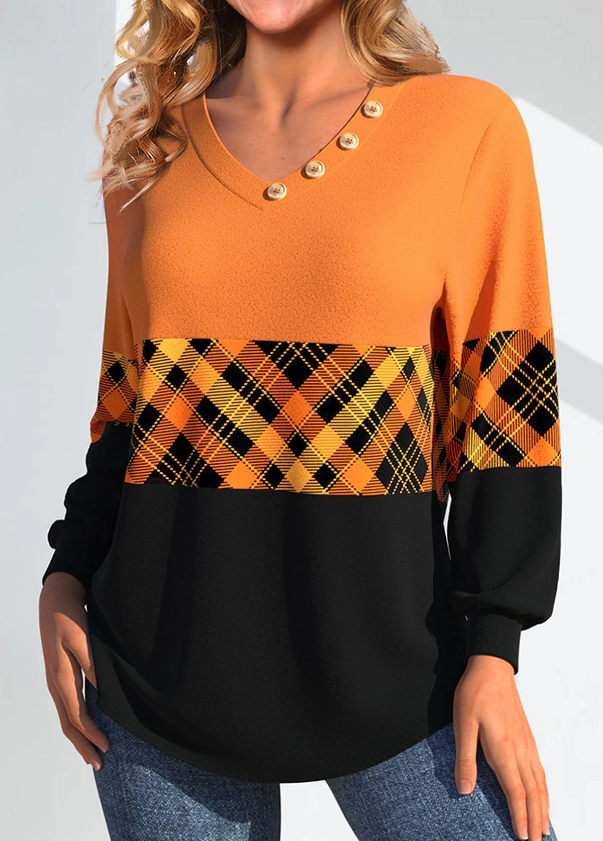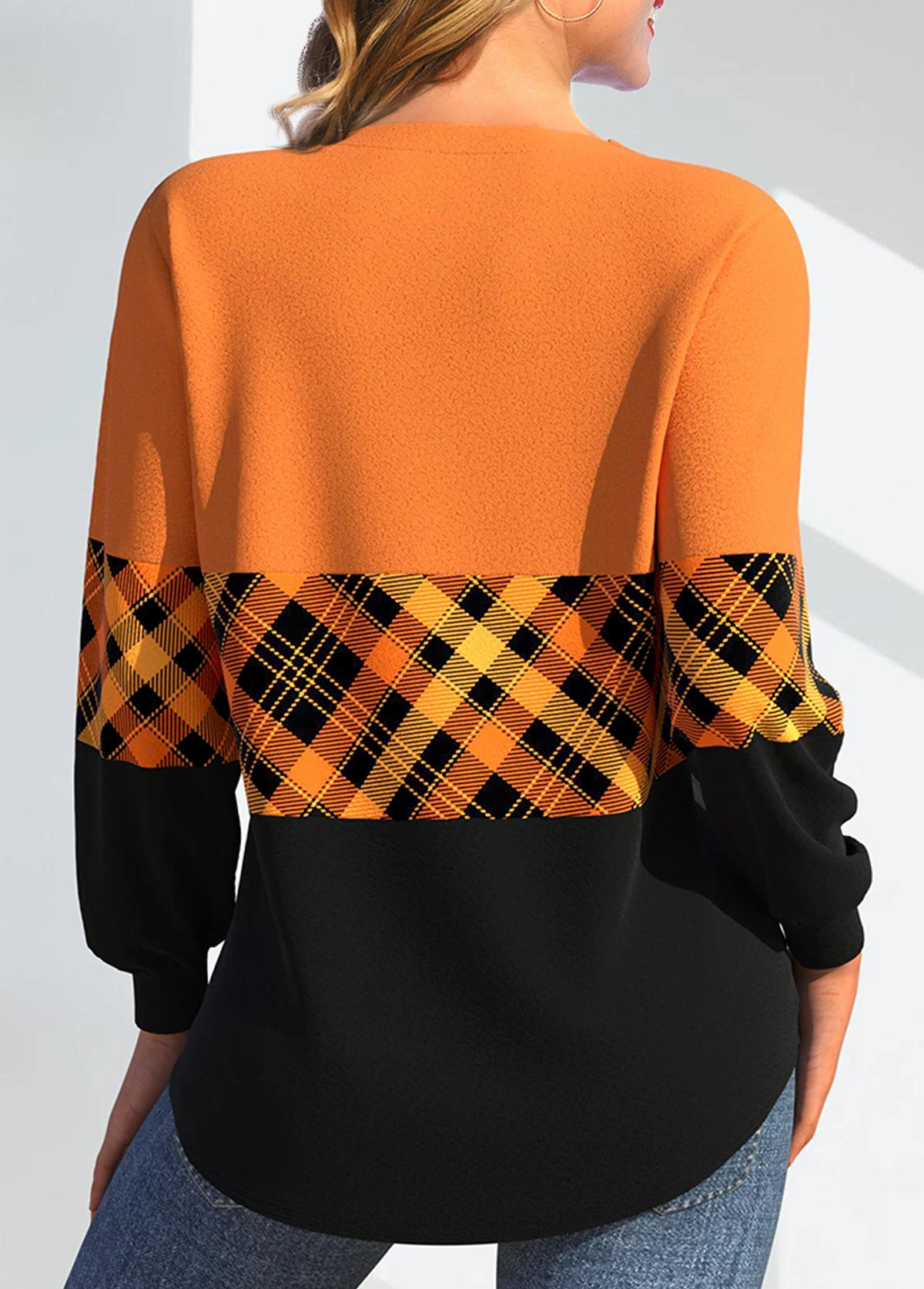 Plaid Patchwork Orange V Neck Long Sleeve Sweatshirt