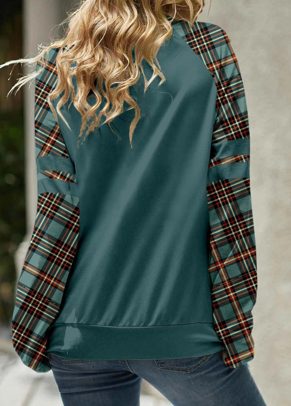 Plaid Patchwork Turquoise Cowl Neck Long Sleeve Sweatshirt
