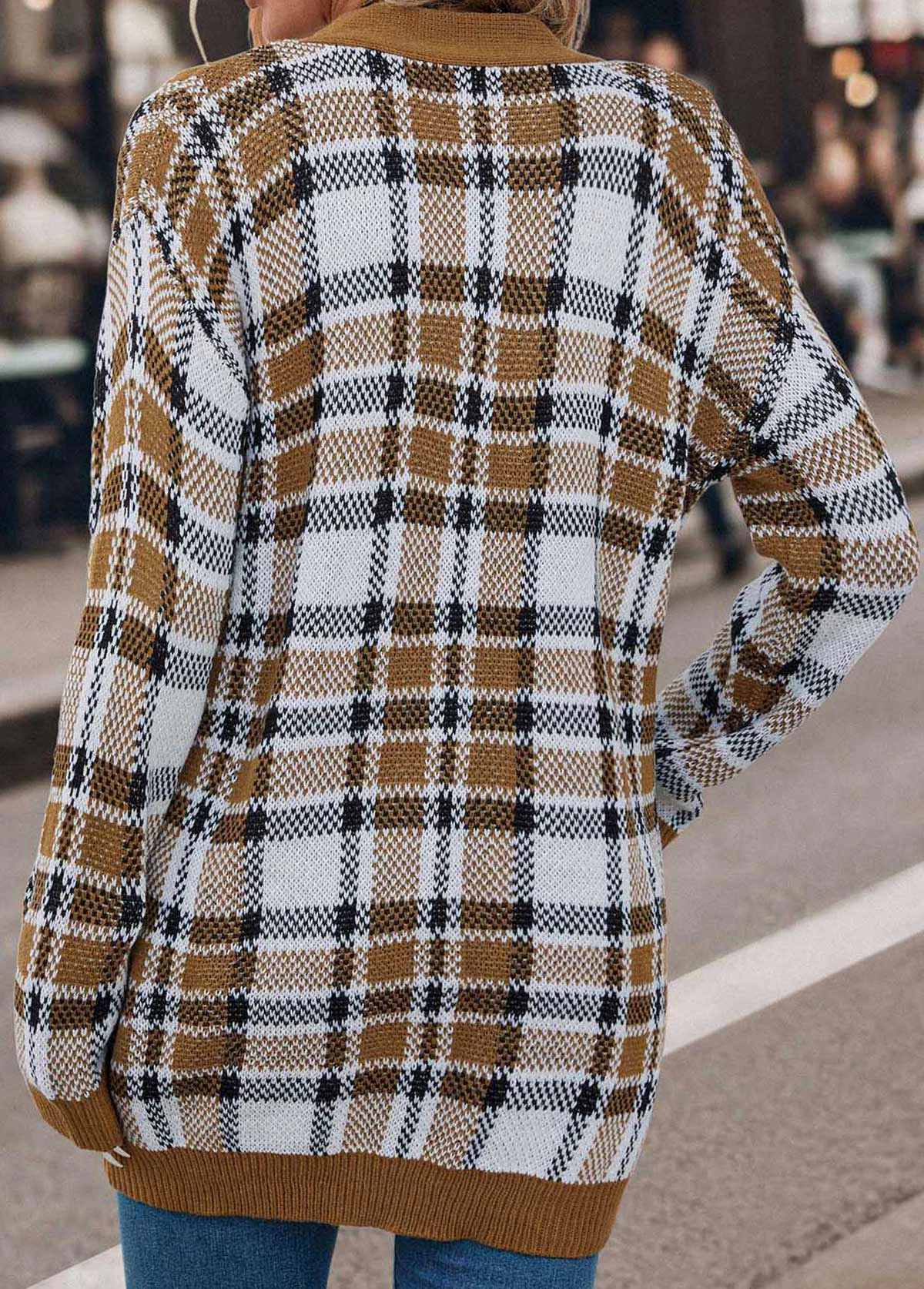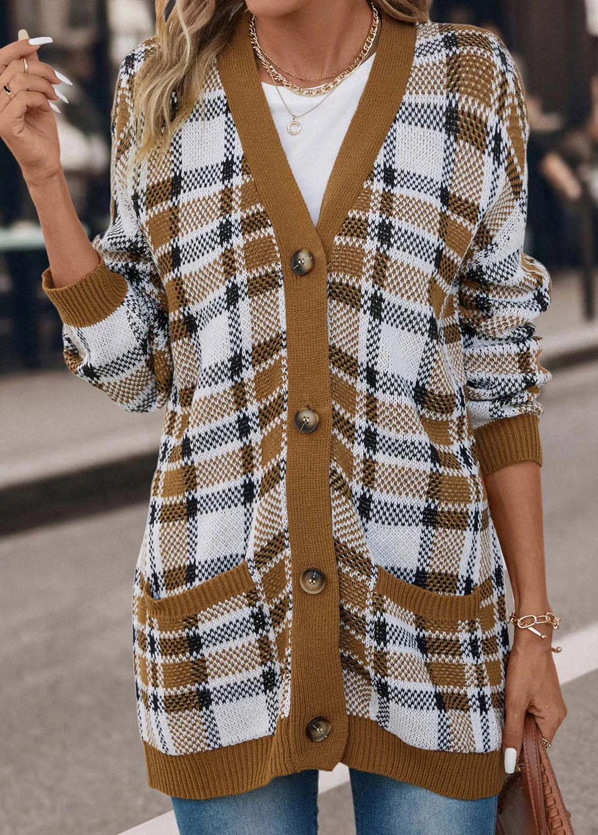 Be the first to review “Plaid Pocket Dark Camel V Neck Cardigan” Cancel reply