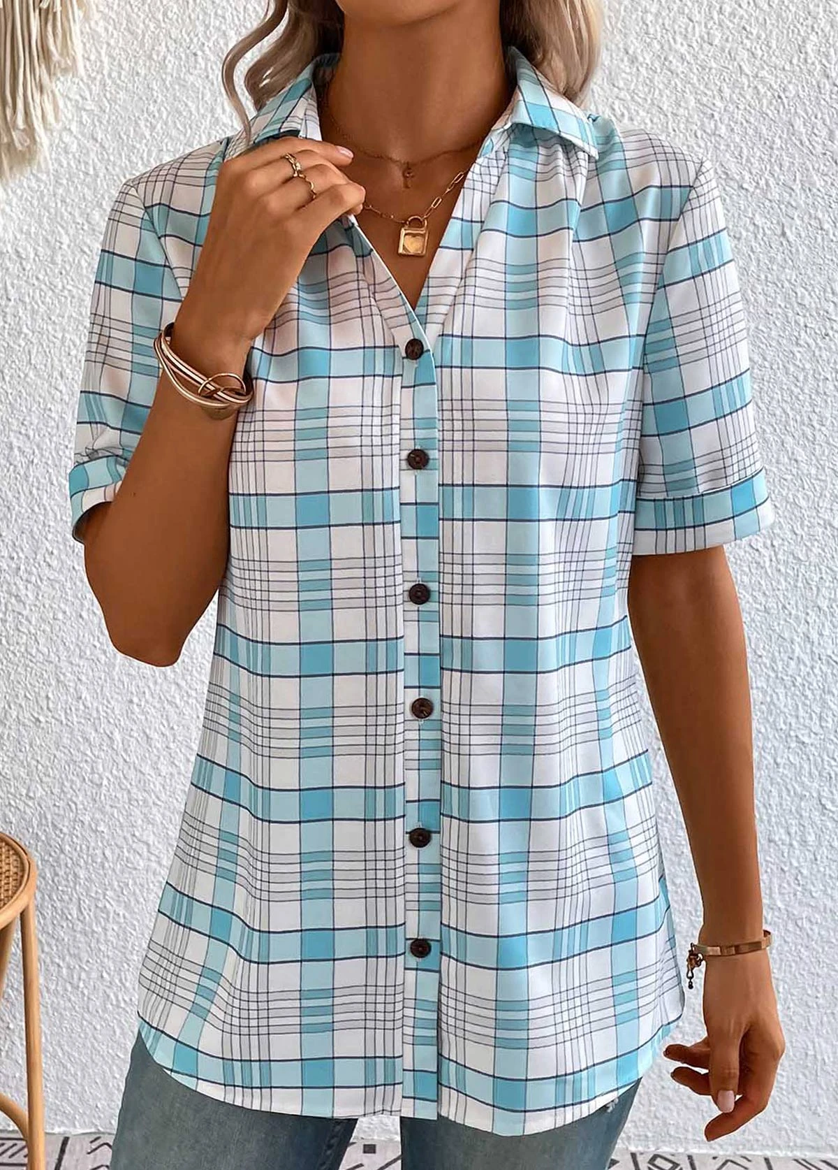 Plus Size Light Blue Button Plaid Blouse