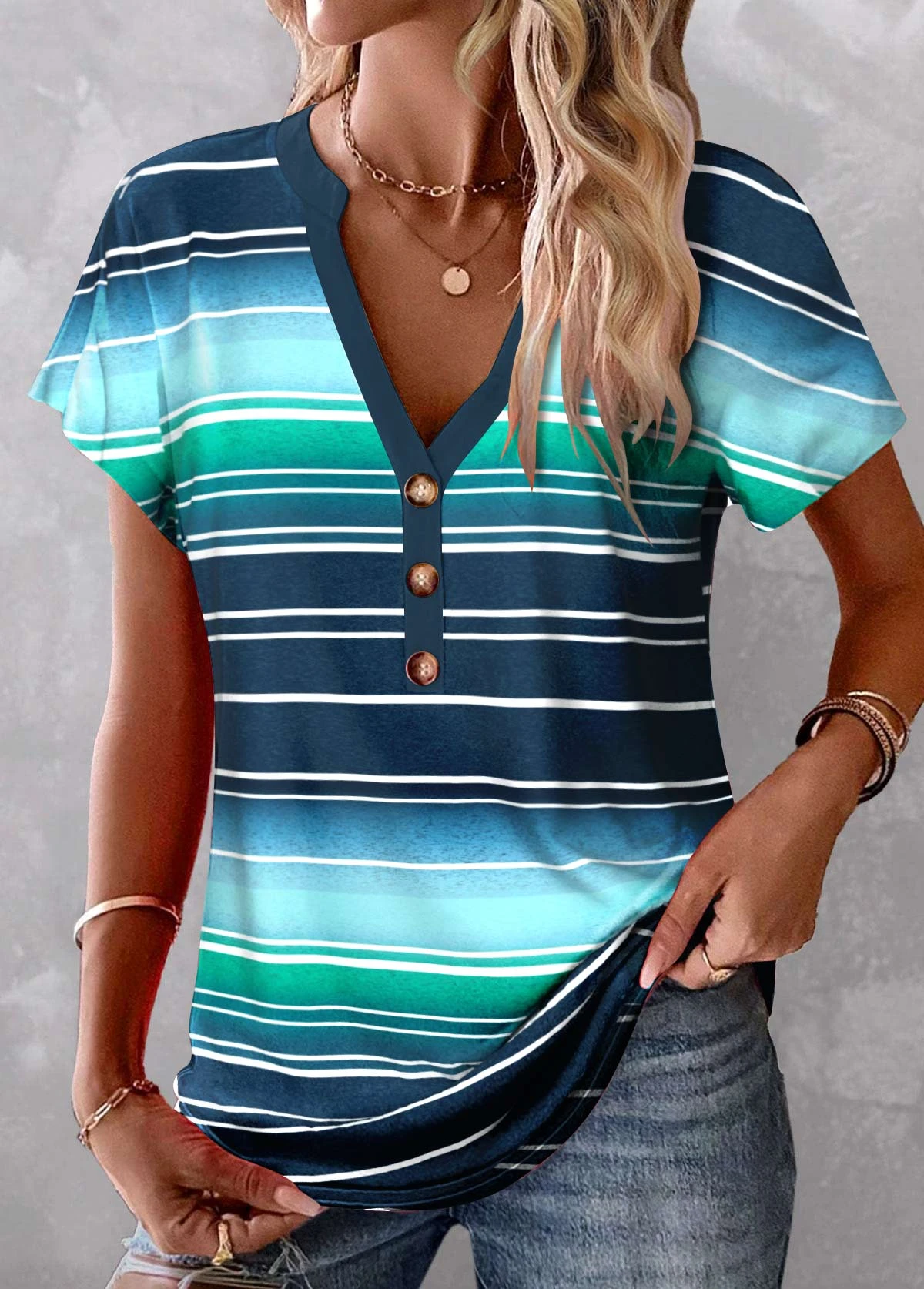 Plus Size Peacock Blue Button Striped T Shirt