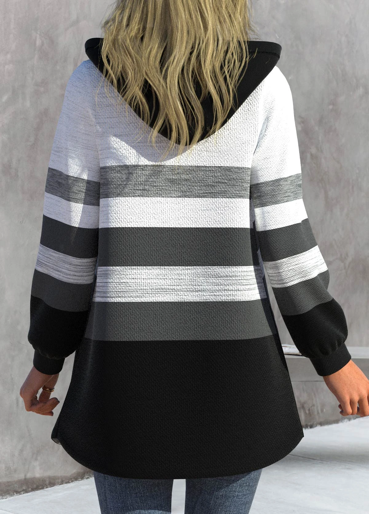 Plus Size Striped Zipper Black Hooded Long Sleeve Jacket