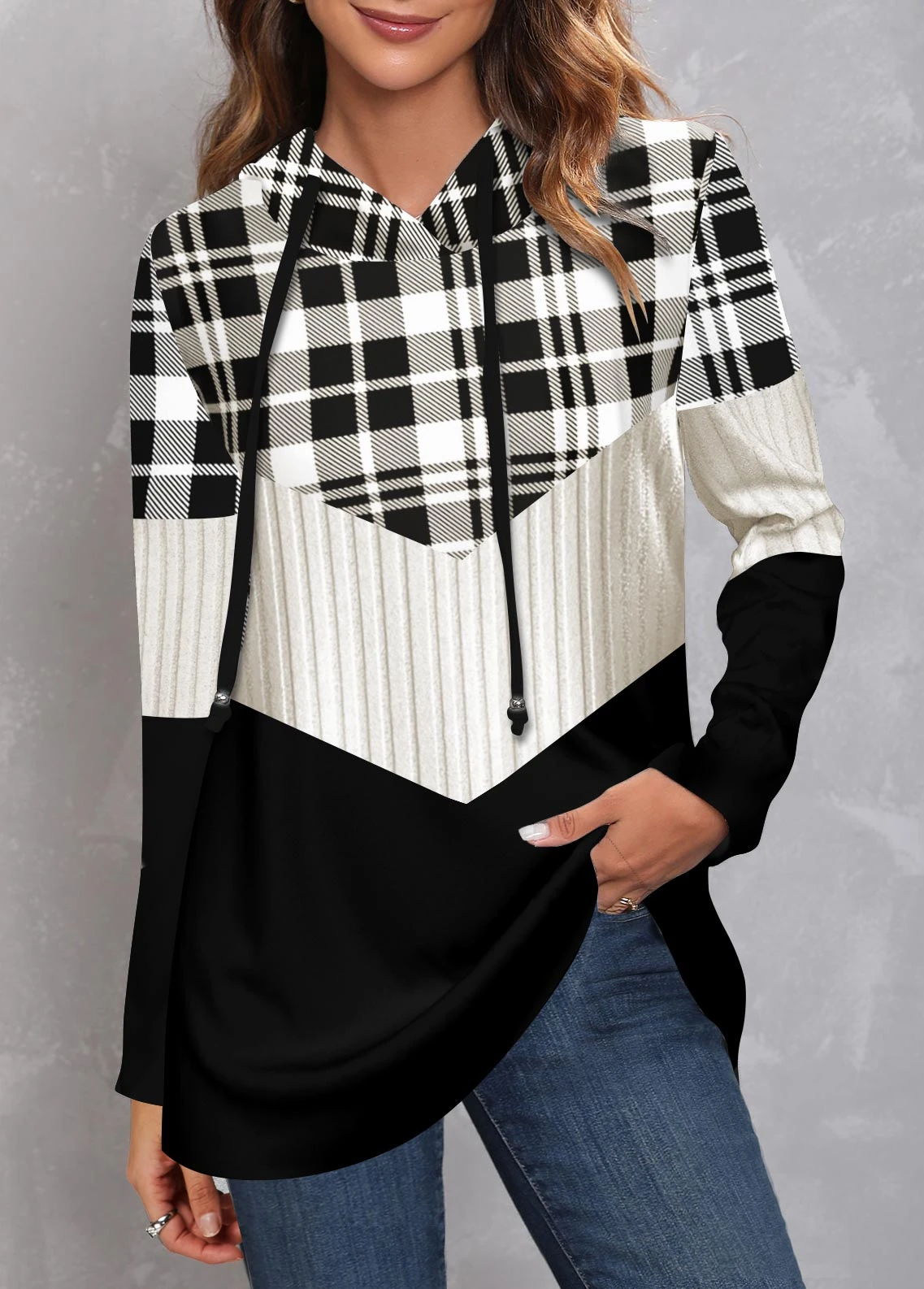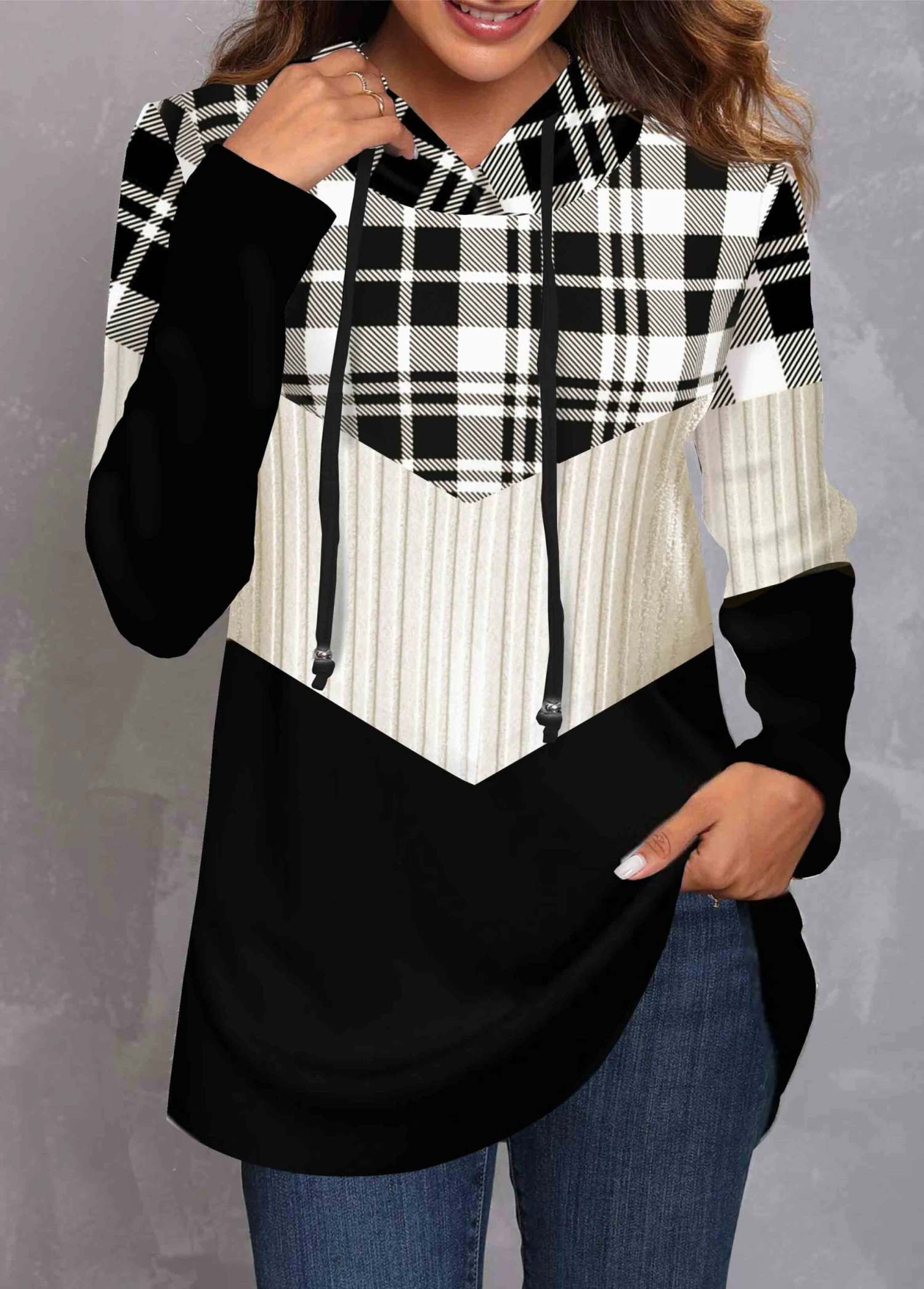 Plus Size Tartan Print Black Regular Sleeve Hoodie