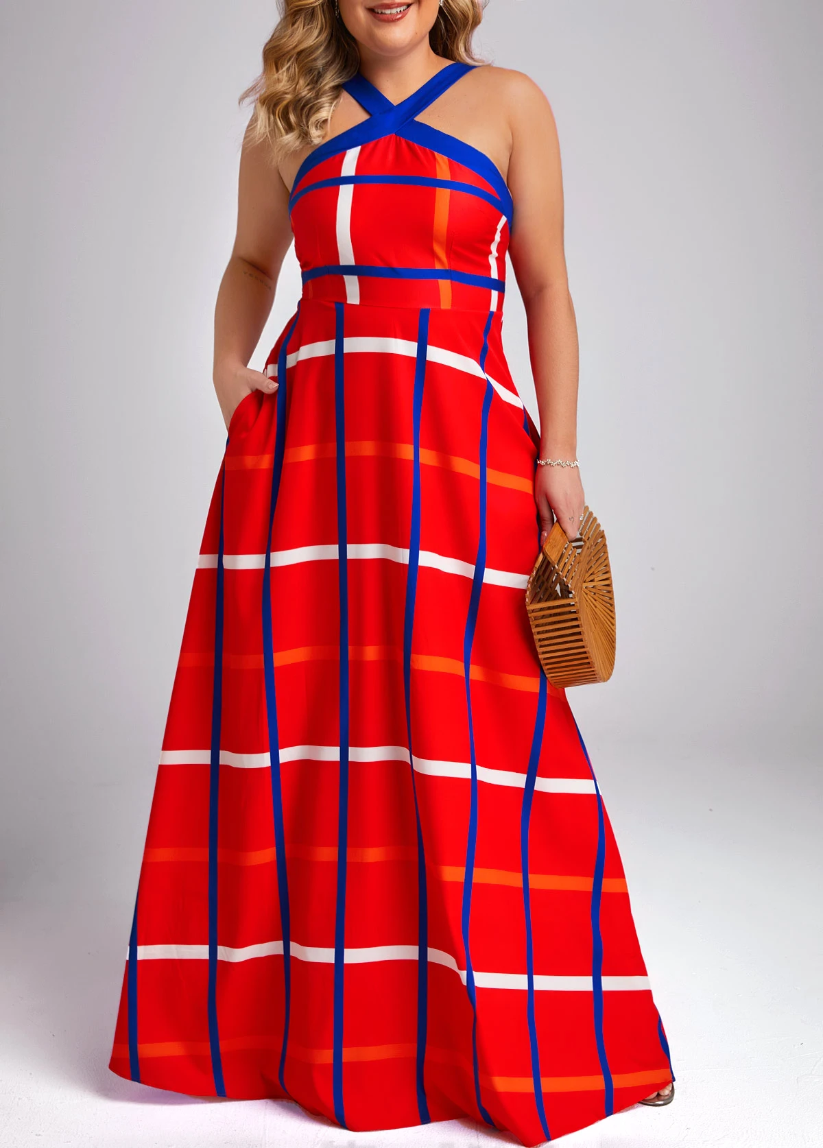 Red Plus Size Pocket Plaid Sleeveless Maxi Dress