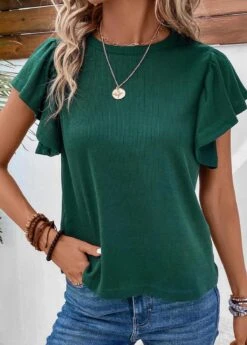 Ruffle Round Neck Short Sleeve Green T Shirt