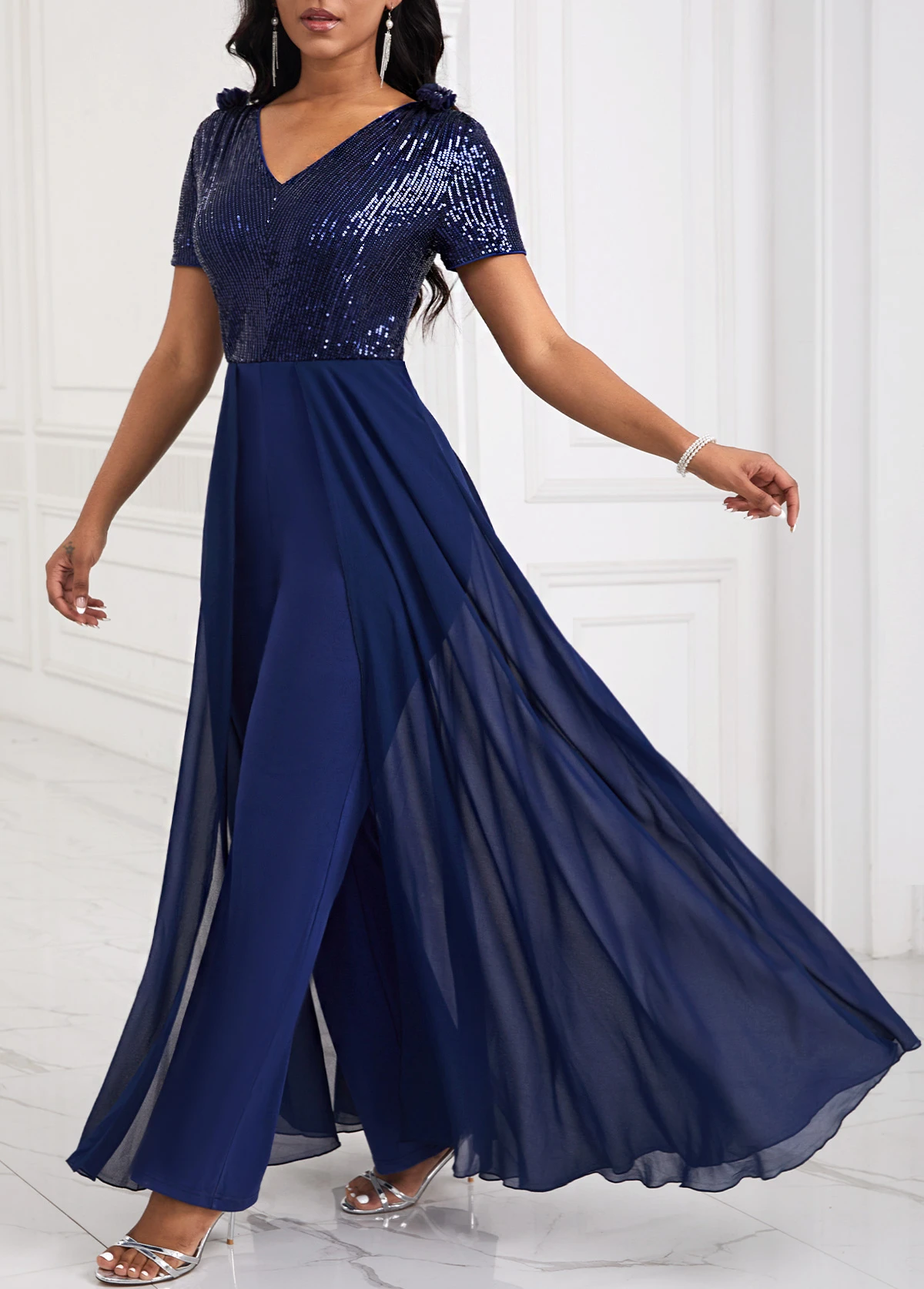 Sequin Long V Neck Short Sleeve Navy Jumpsuit