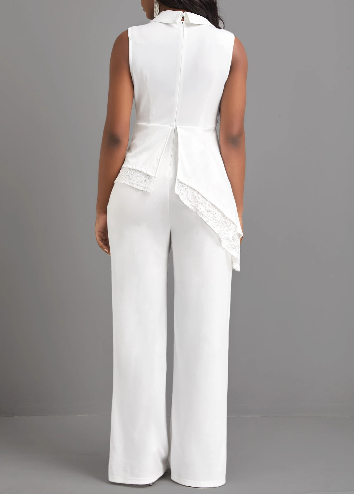 Sleeveless Lace White Long Turn Down Collar Jumpsuit