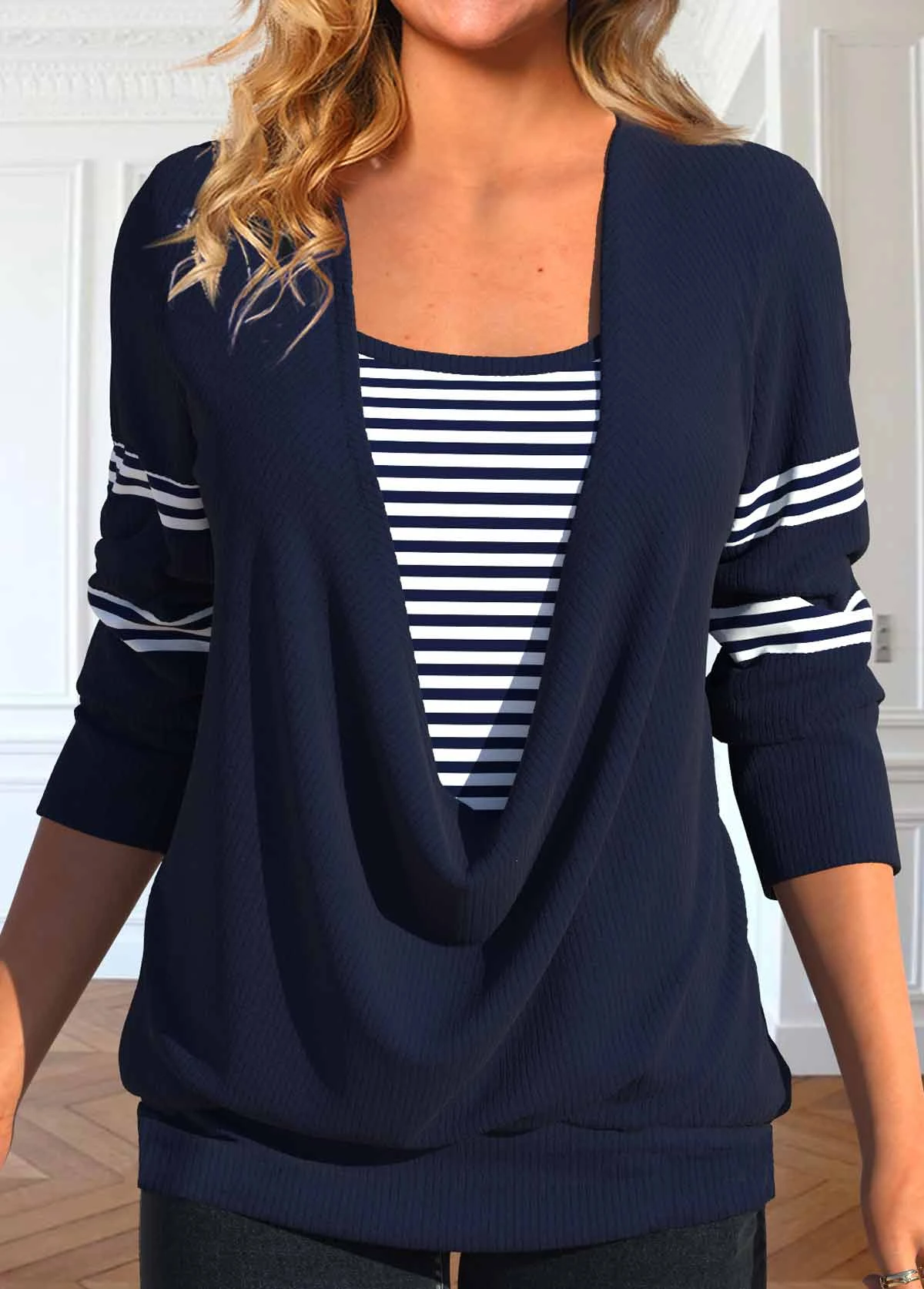 Striped Fake 2in1 Navy Square Neck T Shirt